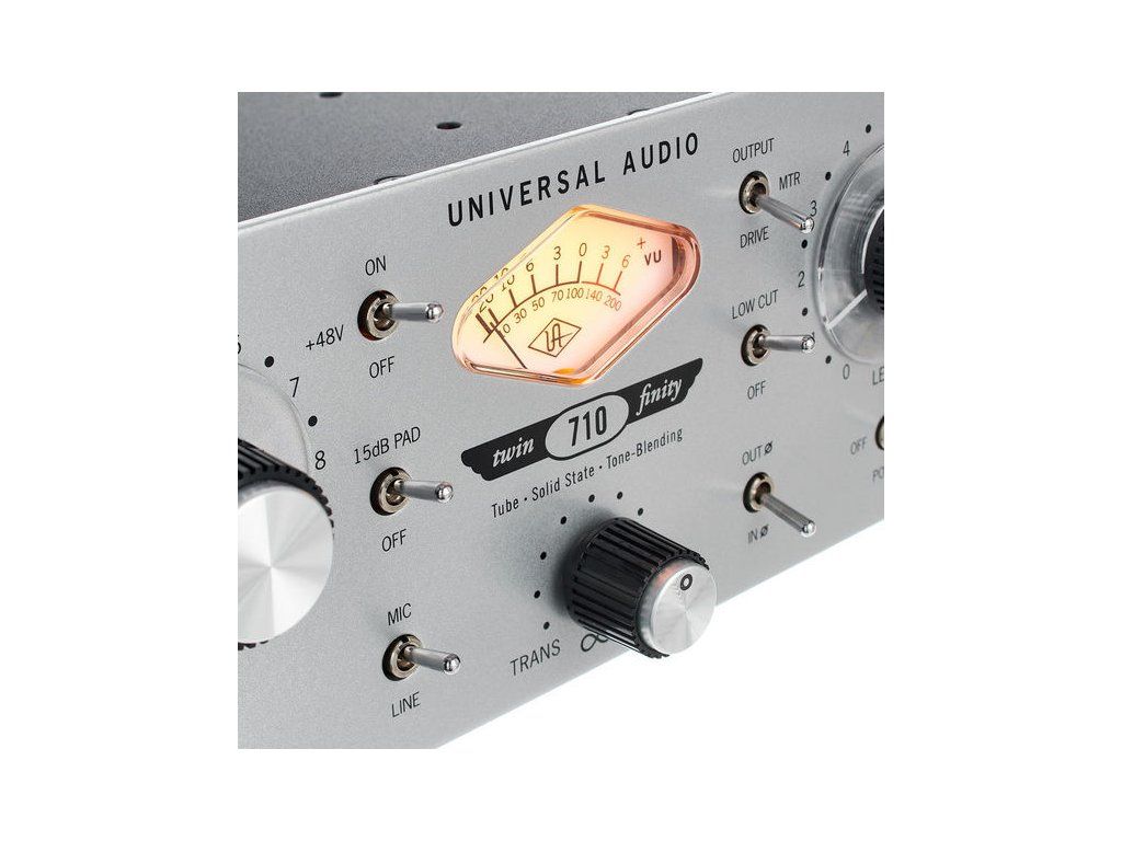 710 Twin Finity je nový UA pream, jedinečně kombinující klasickou „warmth“ UA lampovou část a polovodičové obvody s možností plynulého přechodu mezi nimi, to vše uzavřeno v pevné 2U půl-rackové plechové krabici. 710 byla speciálně vytvořena pro absolutní všestrannost a vysokou variabilitu zvuku už při základním zpracování pomocí preampu.