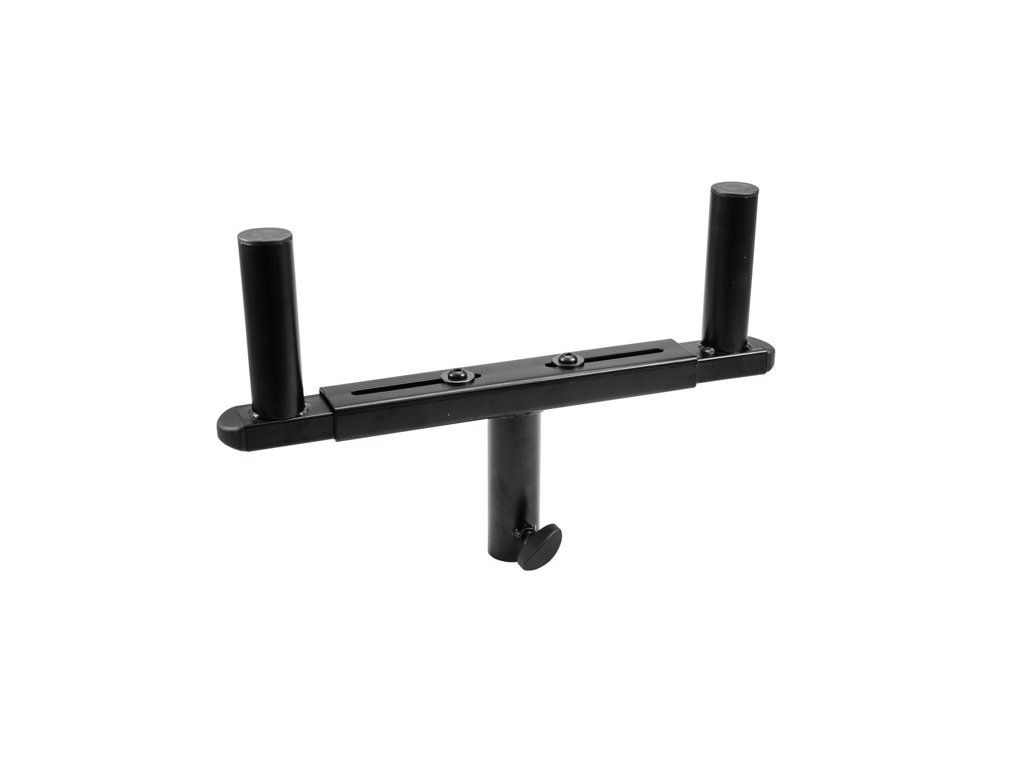 Stand adapter for 2 speaker systems. Distance variably adjustable (310-490 mm). For stands with standard diameter (Ř 35 mm). Black lacquered steel version.Max. load: 2 x 20 kg