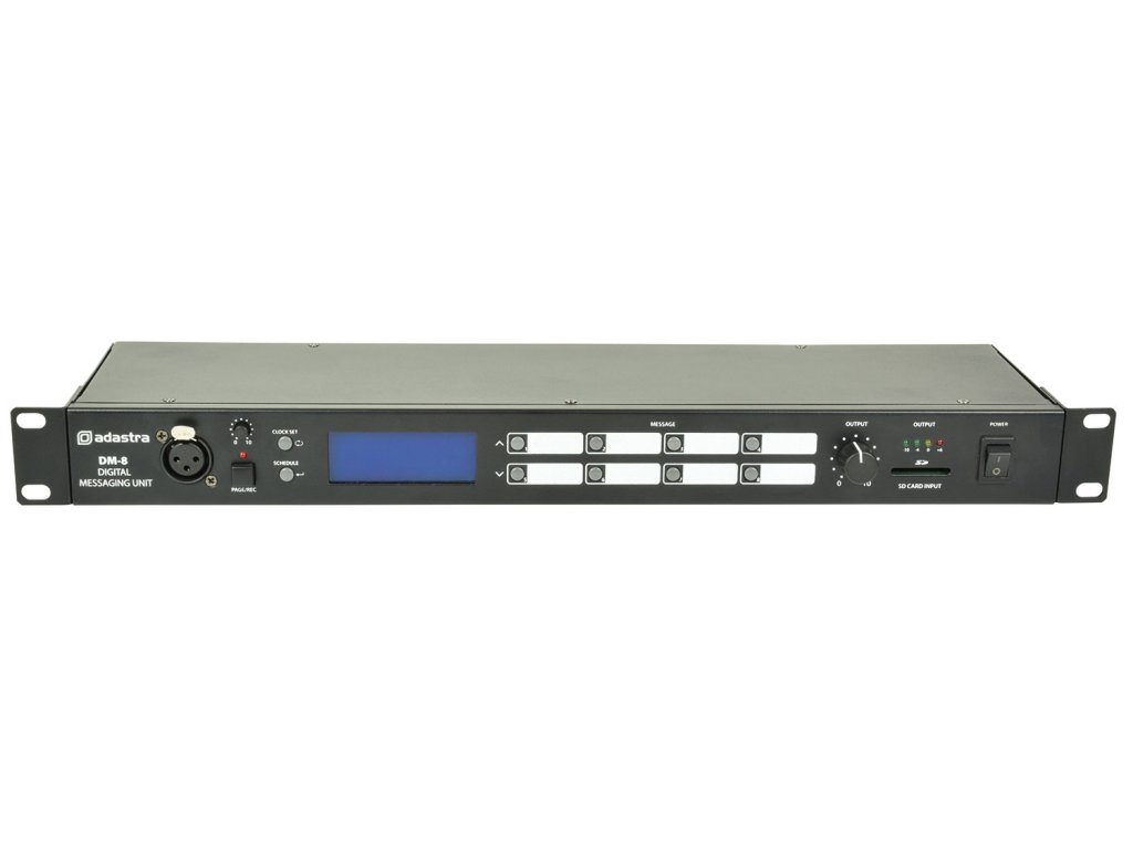Jednotka pro přehrávání digitálních zpráv vhodná pro montáž do racku (výška 1U). Přístroj umožňuje plánované přehrávání zvukových souborů z SD karty. Zvukové soubory jsou uloženy na vyměnitelné SD kartě a lze je snadno editovat a zálohovat v PC, nebo je na paměťové médium ukládat přímo ve vašem přehrávači DM-8. Editace souborů v PC je možná pomocí bezplatného SW. Přehrávací plány lze na SD kartu ukládat jako samostatné soubory. Pro nahrávání zpráv nebo přímé moderování a přehrávání je možné použít mikrofonní vstup na předním panelu přístroje. Na zadním panelu je terminál pro připojení panelového mikrofonu (page MIC) s přepínačem pro fantomové napájení a linkové připojení signálu. Linkový vstup BGM (RCA L/R) na zadním panelu slouží pro přehrávání hudby na pozadí. Linkový i mikrofonní vstup mají vlastní nastavení úrovně signálu pomocí otočného potenciometru. Přehrávání zpráv a přímé moderování má prioritu před podkresovým přehráváním hudby. Na SD kartu je možné uložit až 99 zvukový souborů (skladeb) a 99 plánovaných událostí (zpráv). Přehrávání jednotlivých událostí lze naplánovat ve 24 hodinových cyklech podle jednotlivých dnů v týdnu. Přehrávač DM-8 je možné připojit k libovolnému audiosystému pro snadné přehrávání časovaných oznámení, upozornění nebo přehrávání hudby.Napájení: 100-240V AC, 50/60 Hz nebo 24 V DC