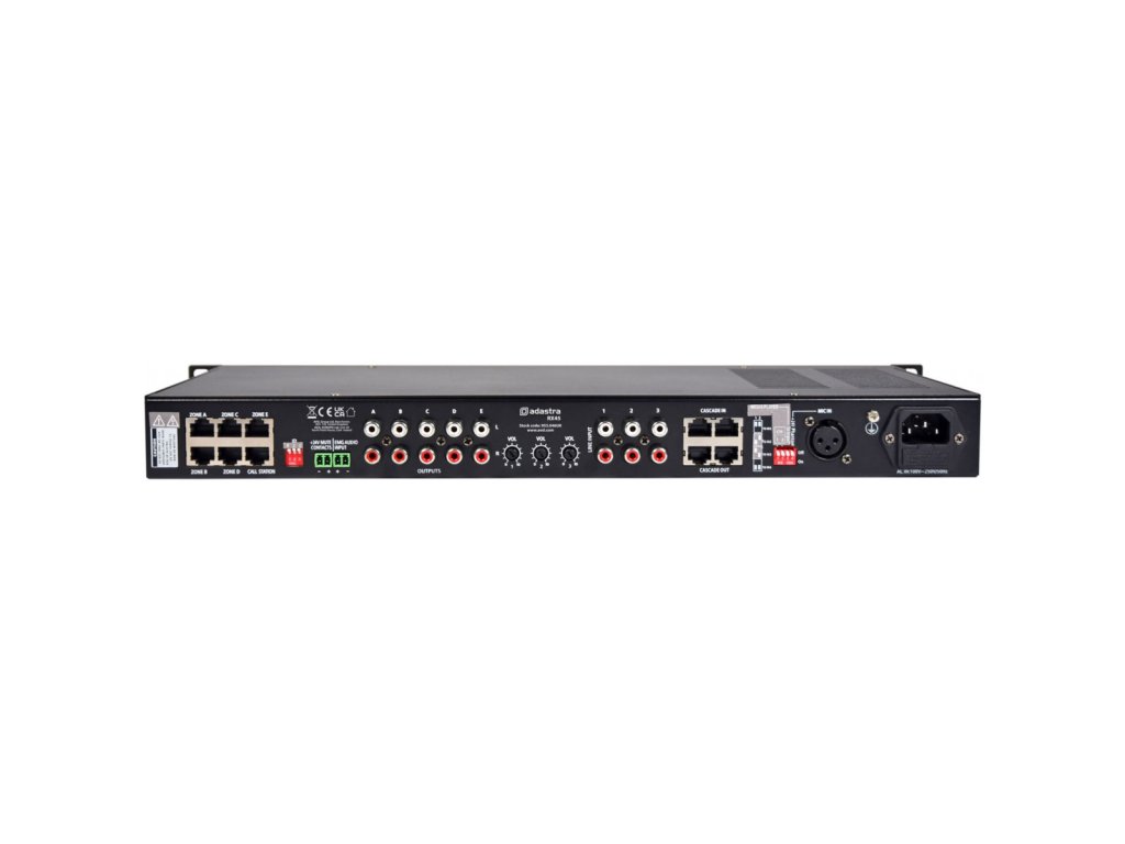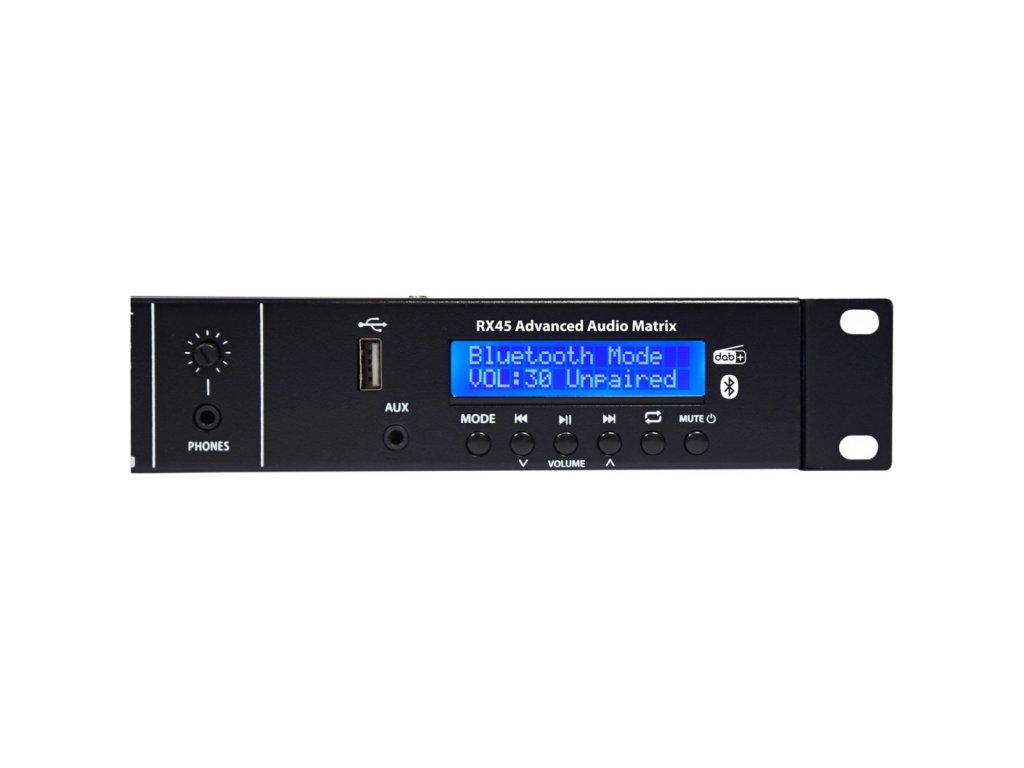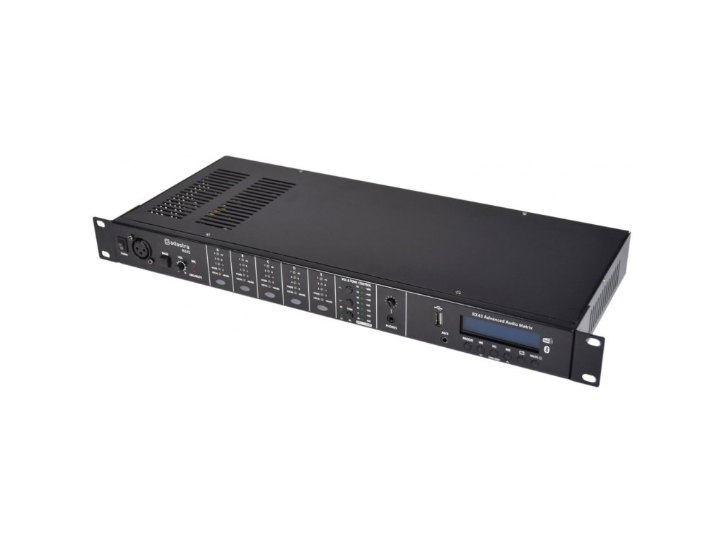 RX45 je 1U audio matice montovatelná do racku a napájející 4 volitelné vstupy do 5 stereo výstupů. Vestavěná sekce audio přehrávače nabízí přehrávání z USB média, DAB tuneru nebo Bluetooth. Každý zónový výstup má na předním panelu tlačítko a LED žebřík pro výběr vstupního zdroje a úpravu nastavení úrovně a tónu v hlavní sekci. Připojení volitelných nástěnných desek TR86 pomocí kabelu CAT5 umožňuje vzdálený výběr zdroje a úrovně pro jakoukoli zónu. Výstup pro vybranou zónu lze sledovat přes sluchátkový výstup na předním panelu. Systém RX45 je rozšiřitelný pomocí několika jednotek RX45, které jsou kaskádovitě propojeny prostřednictvím duálního propojení CAT5, s DIP přepínači pro přiřazení jednoho z 8 různých ID každé připojené jednotce RX45, což poskytuje až 40 odlišných zón. Další DIP přepínače lze nastavit pro propojení audio přehrávače z jedné jednotky s jedním nebo více připojenými podřízenými jednotkami. Rozšiřitelné až na 40 jednotlivých zón (8 x RX45) Vestavěný USB, DAB a BT audio přehrávač Místní nebo volitelné dálkové ovládání TR86 pro každou zónu Při použití dálkového ovládání TR86 je k dispozici místní audio připojení Nouzové ztlumení a nouzové kontakty audio vstupu Jednotky RX45 propojitelné pomocí standardního kabelu CAT5Napájení: 100-250Vac, 50/60Hz (včetně IEC kabelu)