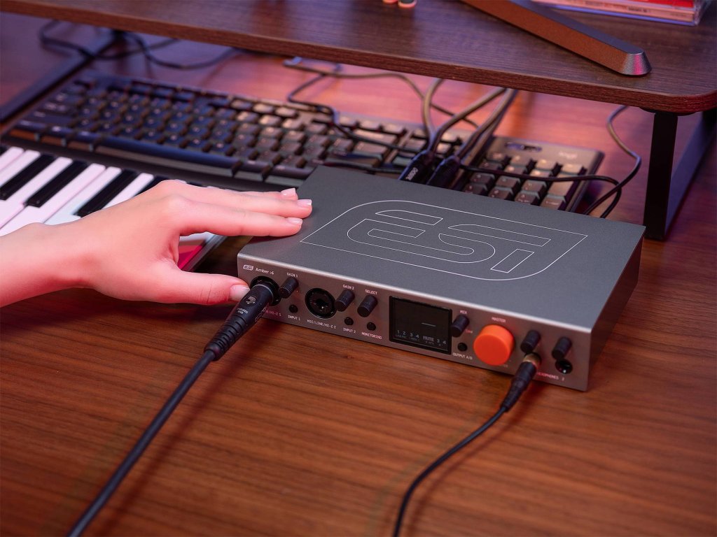 Amber i4 je zatím nejvybavenější zvukovou kartou modelové řady Amber německé značky ESI. Má bohatou konektivitu, přehledný displej a MIDI rozhraní na DIN. Řada Amber je vybavena novým designem s jantarově zbarveným ovladačem hlasitosti. Celkem 4 analogové vstupy - dva nabízejí připojení mikrofonu, linky i nástroje, další dva symetrické umožňují připojit syntezátory, zvukové moduly nebo procesory. Phantomové napájení +48 V u prvních dvou vstupů umožňuje připojení i kondenzátorových mikrofonů. 4 linkové výstupy nabízejí poslech dvou párů aktivních monitorů s regulací z předního panelu, nebo začlenění analogových procesorů do zvukového řetězce.