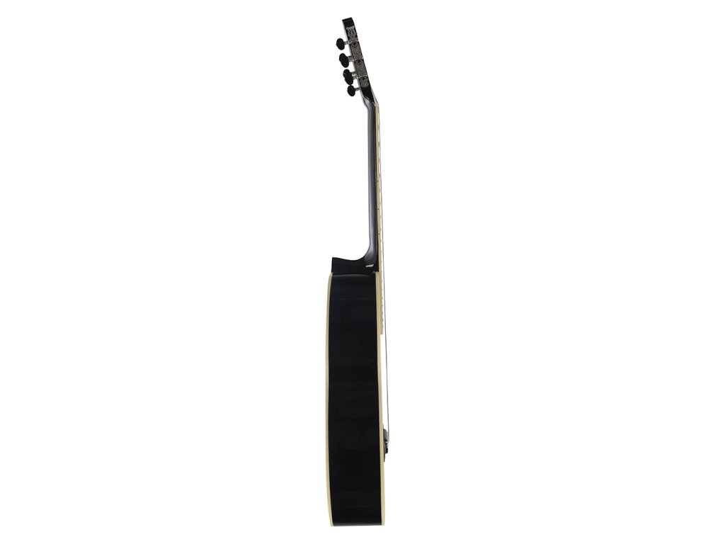 Klasická 4/4 kytara. Vrchní deska smrk, spodní deska a luby sapelli, krk nato s kovovou výztuhou, hmatník a kobylka laurel, menzura 646 mm, nultý pražec kost 52 mm, sedlo kobylky kost, polouzavřená chromovaná mechanika lyra, struny Savarez. Barva černá lesklá.Vrchní deska: smrk