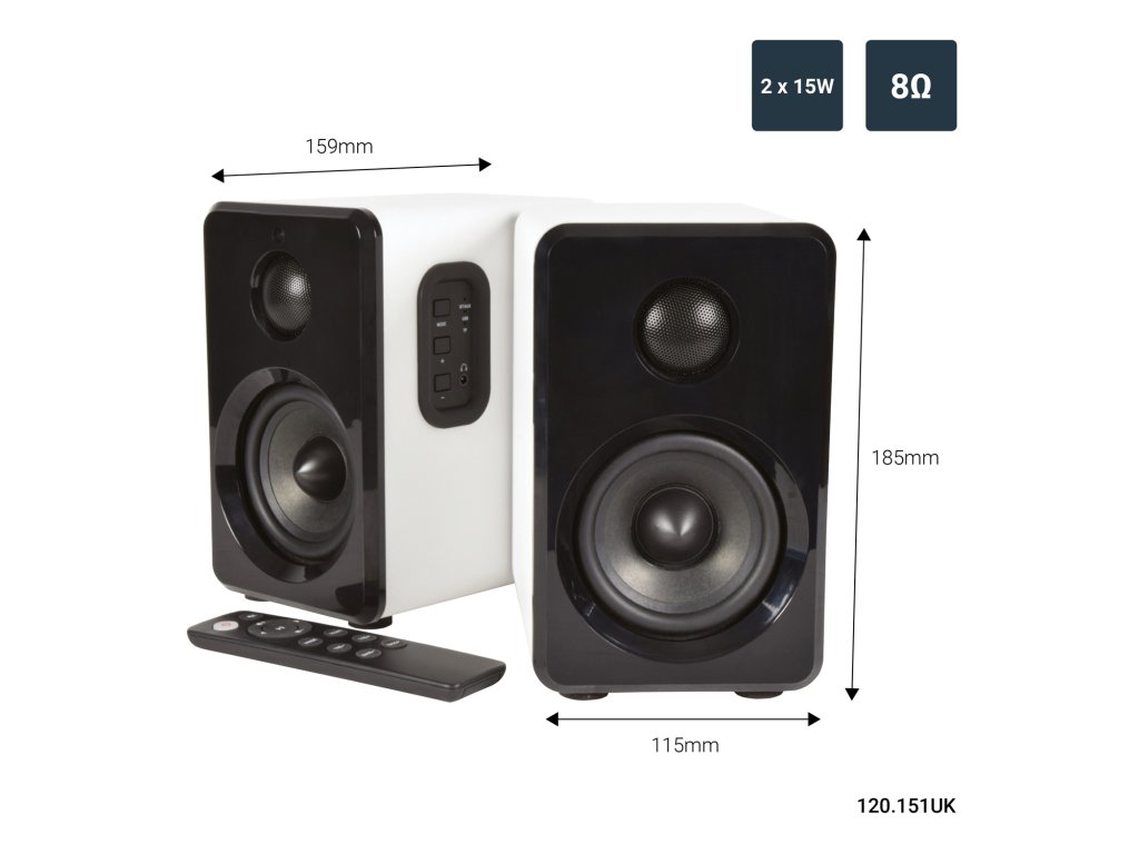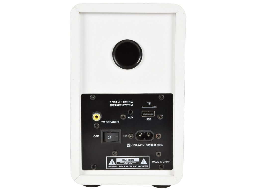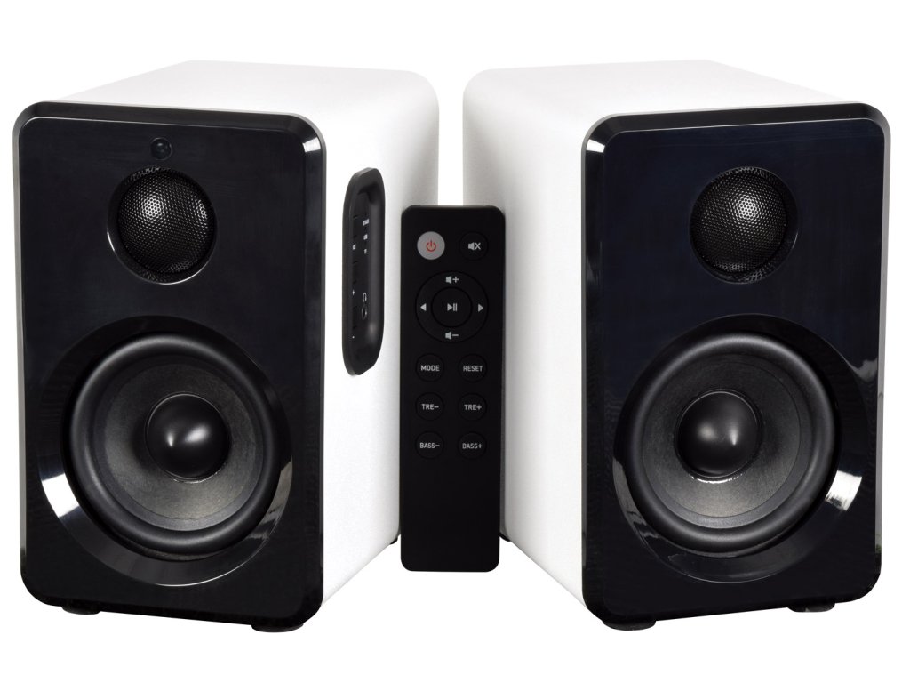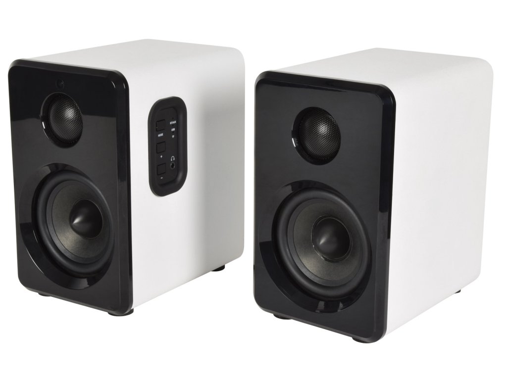 Aktivní sada malých kompaktních reproduktorů. Atraktivní a moderní design, kvalitní zvuk s dostatečným výkonem. Zabudovaný Bluetooth přijímač pro přehrávání hudby z mobilních zařízení, USB port a Micro SD slot pro přehrávání z paměťových médií. Linkový vstup AUX (Jack 3,5 mm) pro připojení externího přehrávače, televizoru, počítače nebo notebooku. Volba režimu přehrávání a regulace hlasitosti na bočním ovládacím panelu reproduktoru. Možnost pohodlného ovládání pomocí přiloženého dálkového IR ovladače. Výkon 2x 15W (8 Ohm), systém je osazen 3,5" basovými a 1" výškovými reproduktory, barevné provedení saténová bílá.Napájení: 100-240 V, 50/60 Hz