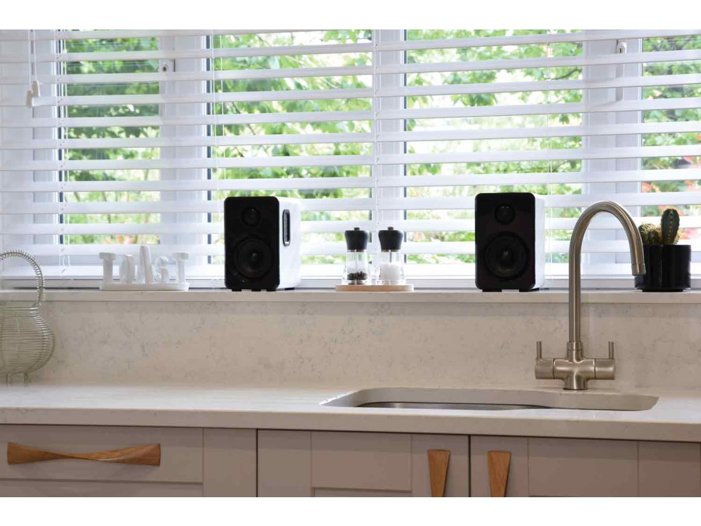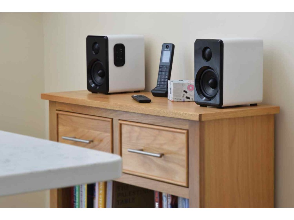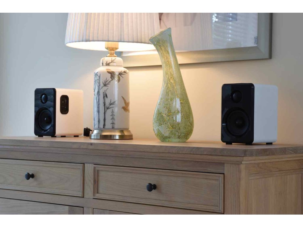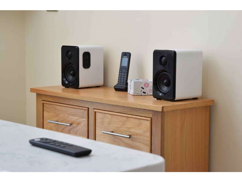 Aktivní sada malých kompaktních reproduktorů. Atraktivní a moderní design, kvalitní zvuk s dostatečným výkonem. Zabudovaný Bluetooth přijímač pro přehrávání hudby z mobilních zařízení, USB port a Micro SD slot pro přehrávání z paměťových médií. Linkový vstup AUX (Jack 3,5 mm) pro připojení externího přehrávače, televizoru, počítače nebo notebooku. Volba režimu přehrávání a regulace hlasitosti na bočním ovládacím panelu reproduktoru. Možnost pohodlného ovládání pomocí přiloženého dálkového IR ovladače. Výkon 2x 15W (8 Ohm), systém je osazen 3,5" basovými a 1" výškovými reproduktory, barevné provedení saténová bílá.Napájení: 100-240 V, 50/60 Hz