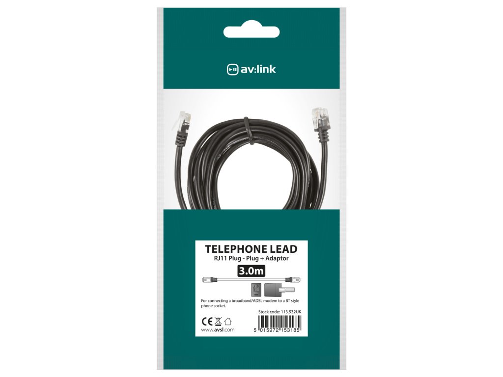 Bare copper conductors Supplied with BT431A telephone plug adaptor Supplied in retail friendly sealed bagColour: Black