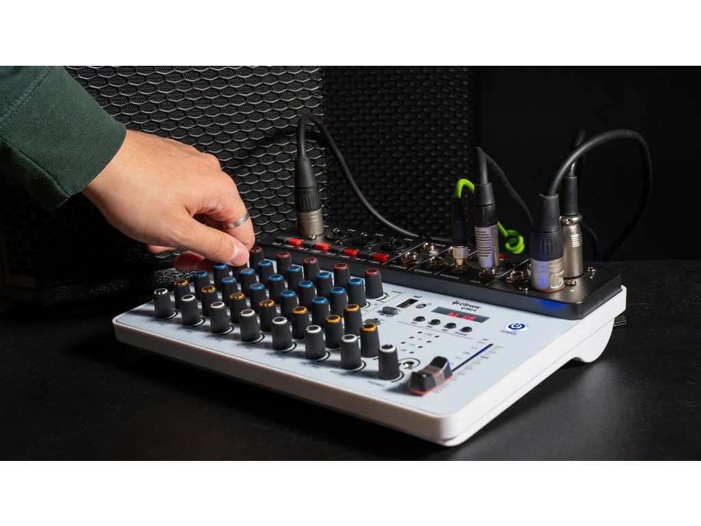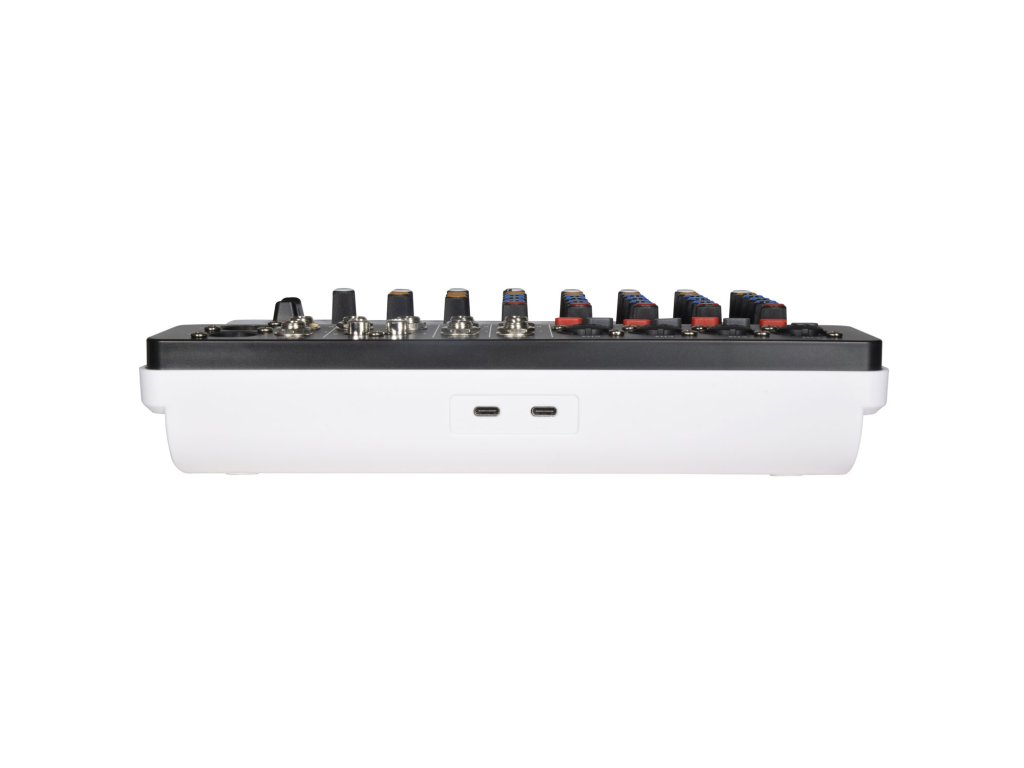 Multifunkční mixážní pult v kompaktním provedení pro živá vystoupení i studiové aplikace. Napájen přes USB-C port s dalším USB-C portem, který slouží jako audio rozhraní pro přímé nahrávání a přehrávání z počítače. 4 mono kanály mohou přijmout XLR vstup pro mikrofon nebo 6,3mm jack pro linkový nebo nástrojový vstup (volitelné) s přepínatelným 48V fantomovým napájením pro kondenzátorové mikrofony. Ty lze v případě potřeby směrovat do interní sekce delay efektů pro echo efekty. Dva další stereo linkové kanály mohou přijmout 6,3mm jack nebo jeden jack pro mono provoz. Každý kanál má ovládání gainu s ovládáním basů a výšek. Kromě toho je k dispozici ovládání AUX, které směruje signál kanálu do interní sekce digitálních delay efektů nebo jej lze alternativně přivést k externímu zařízení přes výstupní jack AUX. K dispozici je konektor USB typu A pro přehrávání souborů mp3 z flash disku a přehrávač médií má dokonce vestavěný Bluetooth přijímač pro bezdrátové přehrávání z chytrého telefonu nebo tabletu. Výstupy zahrnují hlavní výstupy jack a XLR, nahrávací a sluchátkový výstup. Díky těmto komplexním funkcím je tento přístroj užitečným nástrojem pro živá vystoupení, projektová studia, DJské služby na notebooku a podcasting. Dodává se s napájecím adaptérem USB-C Audio rozhraní USB-C Digitální audio přehrávač MP3/WMA s rozhraním USB-A Bluetooth přijímač pro bezdrátové streamování zvuku Individuálně přepínatelné fantomové napájení 48 VNapájení: 5Vdc 3A (adaptér USB-C je součástí dodávky)