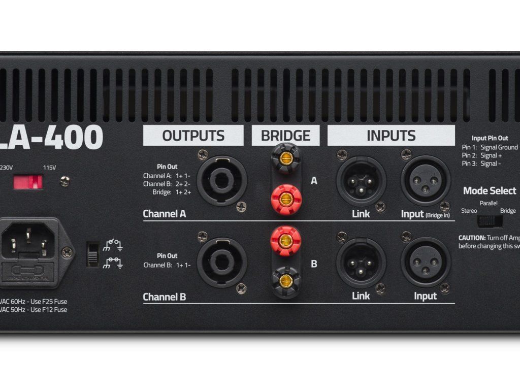 CLA-400 dává výkon přes 360 W / 8 Ohm, nebo 540 W / 4 Ohm. Při zapojení do můstku může zesilovač poskytnout výkon až 760 W / 8 Ohm.