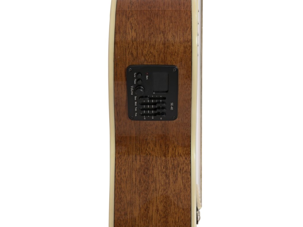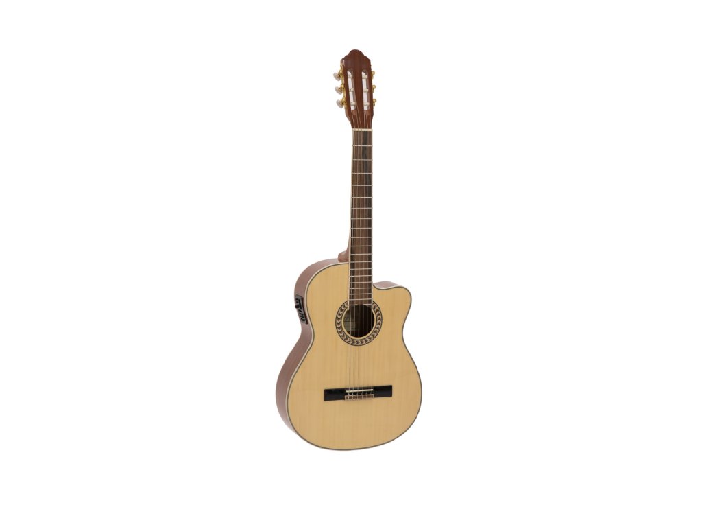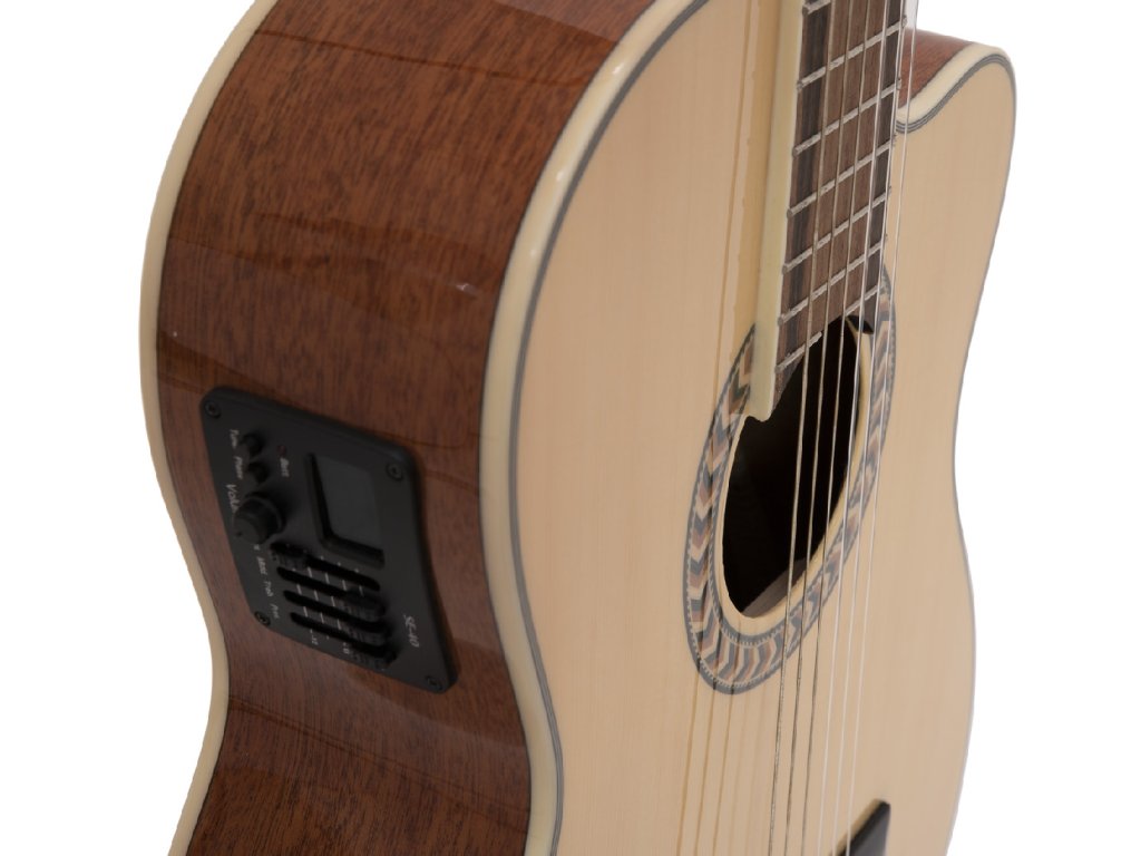 Elektroakustická klasická kytara 4/4 s výkrojem. Vrchní deska smrk, spodní deska a luby mahagon, krk nato, hmatník ořech, kobylka javor, menzura 650 mm, nultý pražec 50 mm, lemování těla bílou výložkou, mosazná mechanika s perleťovými knoflíky. Aktivní elektronika, kobylkový snímač, vestavěná chromatická ladička, ovládání hlasitosti, basů, středních a vysokých tónů, přepínač fáze, indikátor vybití baterie, výstup Jack 6,35 mm. Barva přírodní lesklá.Vrchní deska: smrk