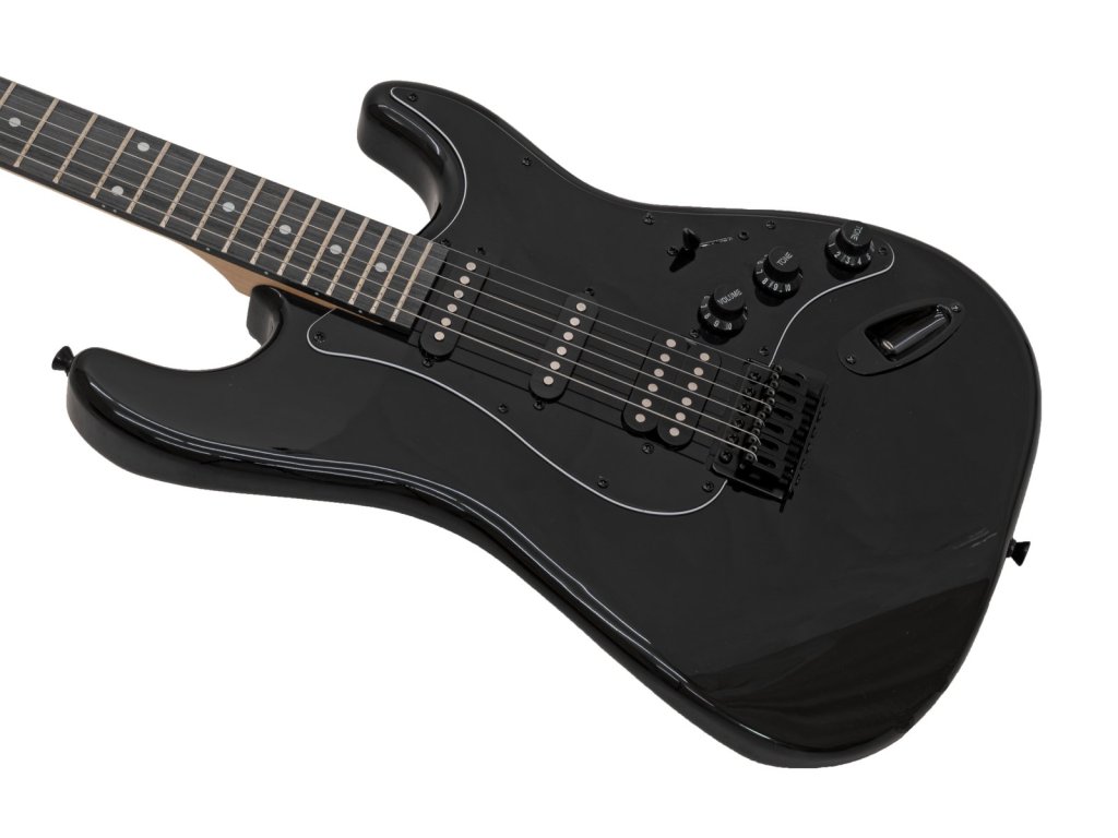 Elektrická kytara typu Strat. Tělo jasan, šroubovaný krk javor, menzura 648 mm, hmatník palisandr, 22 pražců, černý pickguard, kobylka klasické tremolo typu Strat, chromovaná mechanika, 1x dvoucívkový snímač (Humbucker), 2x jednocívkový snímač (single coil), 1x ovládání hlasitosti, 2x ovládání tónu, 5-ti polohový přepínač. Barva černá, lesklá.Tělo: jasan