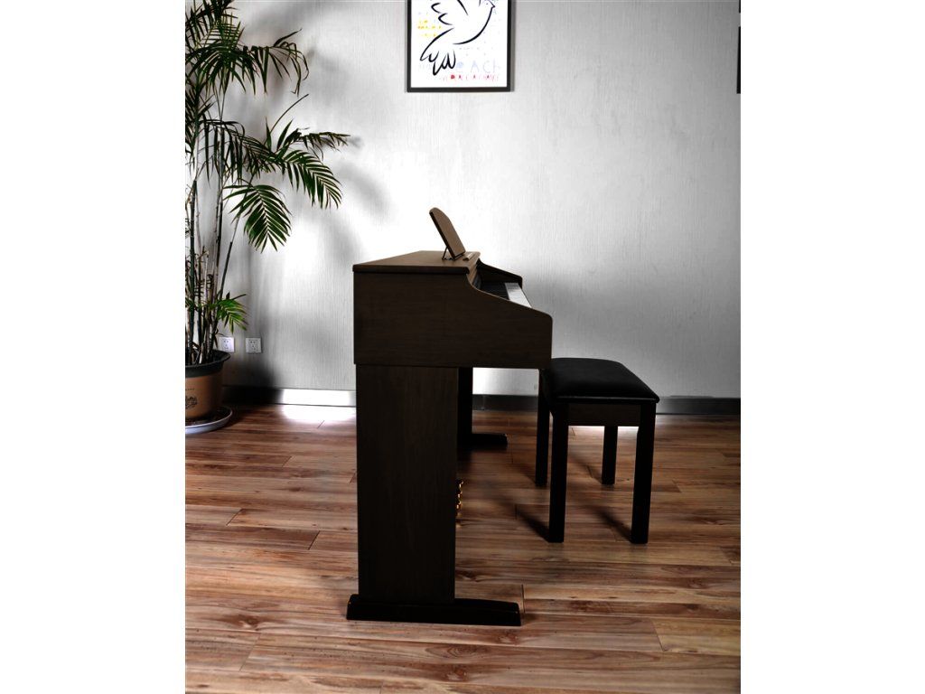 Klavírní skříň je v provedení tmavého palisandru s čistými liniemi, které doplní jakýkoli dekor interiéru.