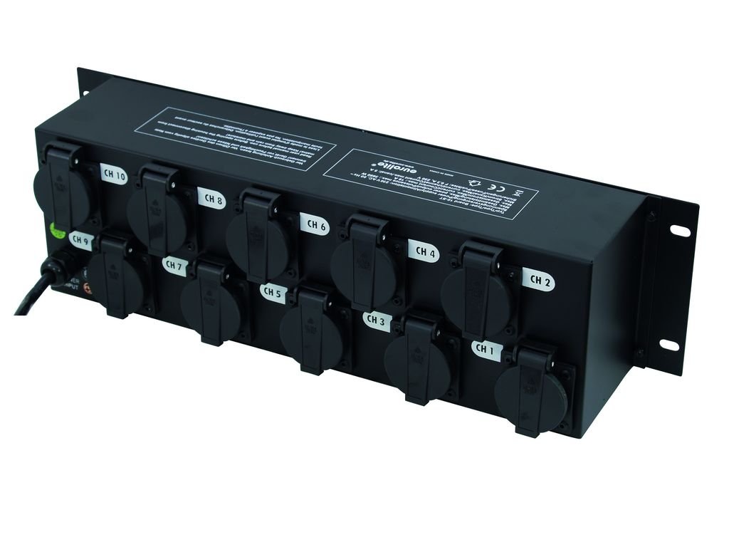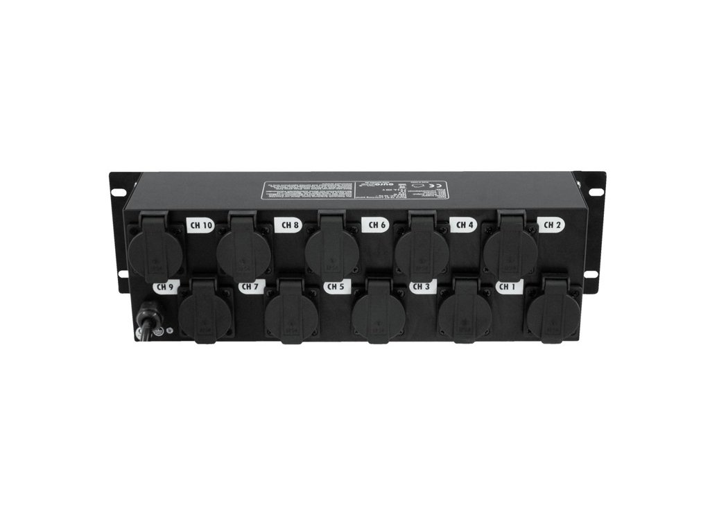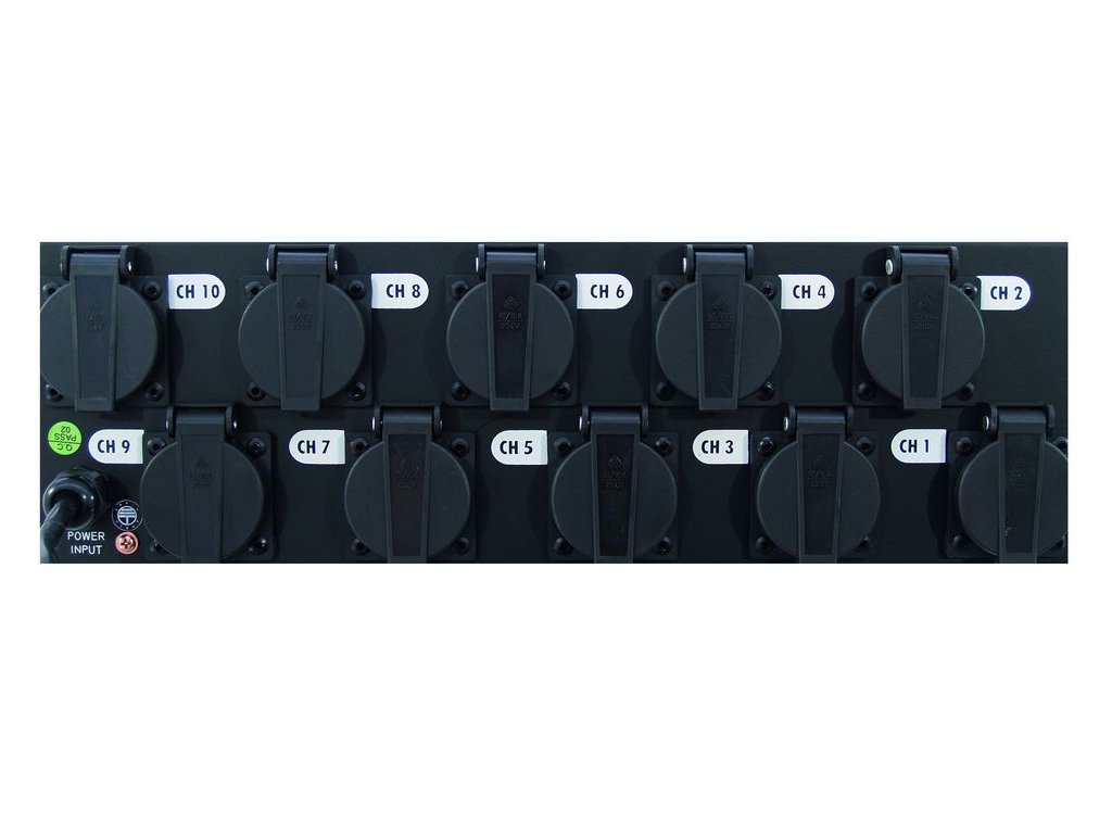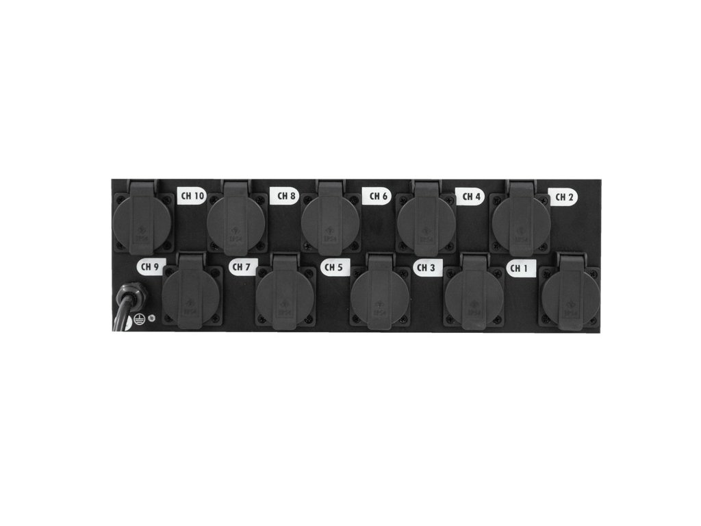 Spínací skříň s 10 zásuvkami. Pro 16 A zástrčku. 10 vypínačů. S 10 10 A držáky na pojistku. Tento výrobek je vybaven zásuvkami typu Schuko CEE 7/4 (typ F) bez otvoru pro zemnící kolík. Vhodné pro zástrčky Schuko (typ F) a univerzální zástrčky CEE 7/7. Nemusí být kompatibilní s českými zástrčkami (typu E). V případě mechanické nekompatibility doporučujeme dokoupení vhodného typu koncovky.Power supply: 230 V AC, 50 Hz