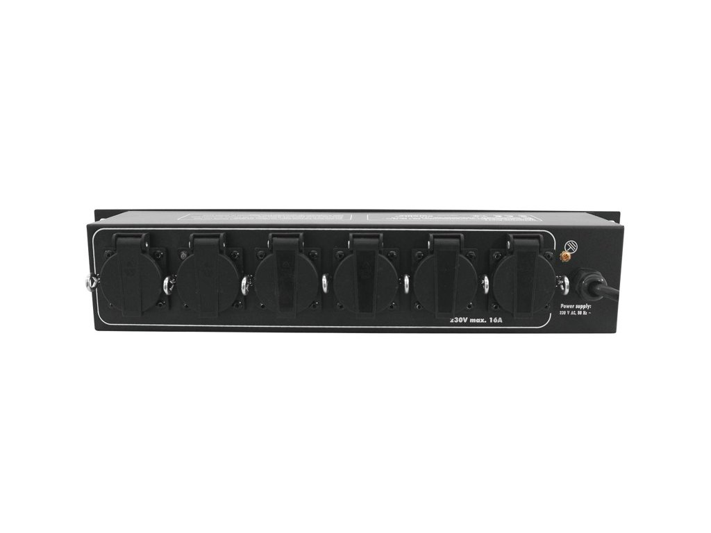 Power distributor with switching panel with 6 safety socketsFully cabled housing with 6 safety sockets For 16 A safety-plug 1 switch Control: without Tento výrobek je vybaven zásuvkami typu Schuko CEE 7/4 (typ F) bez otvoru pro zemnící kolík. Vhodné pro zástrčky Schuko (typ F) a univerzální zástrčky CEE 7/7. Nemusí být kompatibilní s českými zástrčkami (typu E). V případě mechanické nekompatibility doporučujeme dokoupení vhodného typu koncovky.Power supply: 230 V AC, 50 Hz