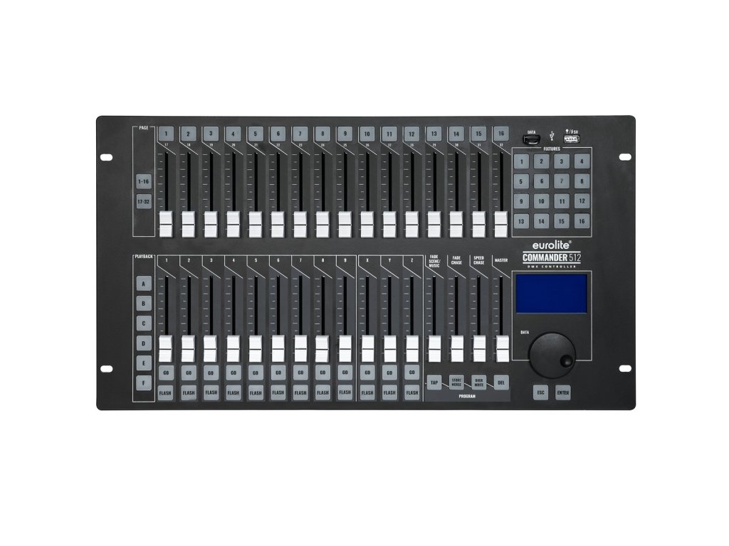 Moderní divadelní osvětlovací pult pro 512 DMX kanálů, samostatné stmívací fadery pro scény a programy. Navrženo pro pohyblivá světla, světelné efekty, LED bodová světla a stmívače. 57 scén/programů (chase), 767 cue distribuovaných na 9 stránkách Snadno nastavitelné hlavní stmívání, fade time a doba chodu Včetně různých barevných krytů faderů Dobrá vizuální kontrola scén a programů pomocí inteligentních stavových LED Manuální, časově řízený nebo zvukem řízený režim běhu programu (chase) Několik programů a scén lze spustit současně Ovládání zvukem pomocí audio signálu nebo tlačítka TAP USB port pro ukládání dat programu (19") 48,3 cm instalace do racku 6 U Ovládání přes DMX; Zvukem přes mikrofon; Zvukem přes 6,3 mm jack konektor (stereo) LCD displej Pro oblasti použití, jako jsou: Kluby/taneční školy; Svatby/gala akce; Vybavení veletrhů a obchodů; pódia; divadla; restaurace, bary a hotely; Pronájmy Firmware lze aktualizovat Obsah balení: 1 x zařízení, 1 x uživatelská příručka, 1 x napájecí kabel, 1 x barevné krytky, 1 x USB klíčenkaNapájení: 100-240 V AC, 50/60 Hz