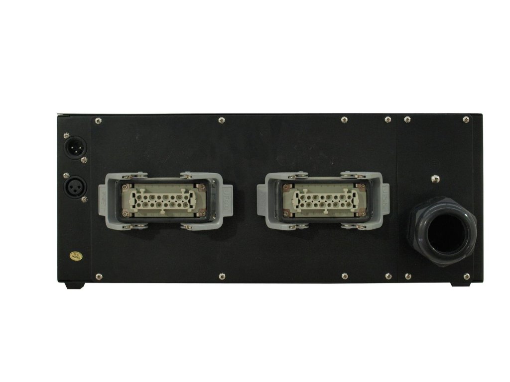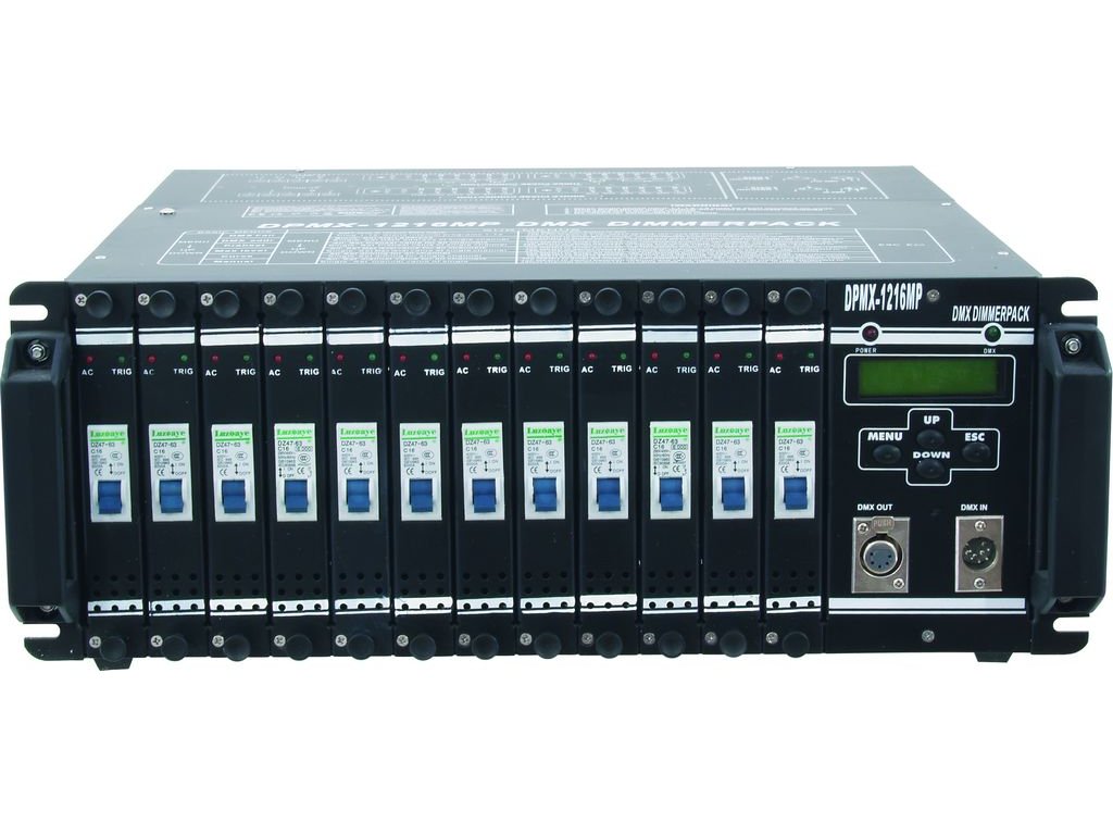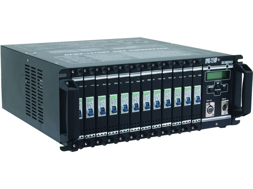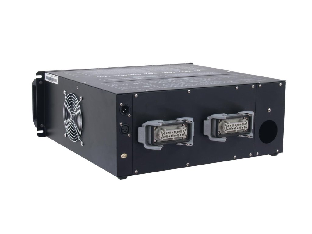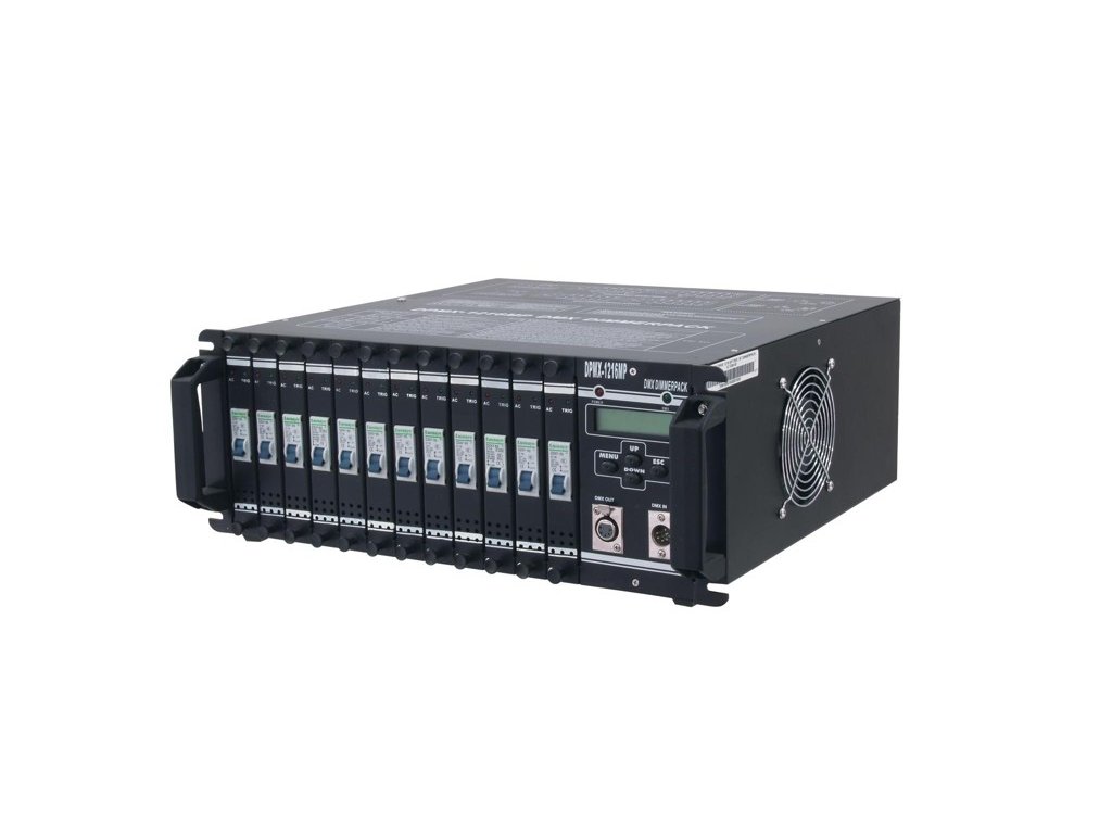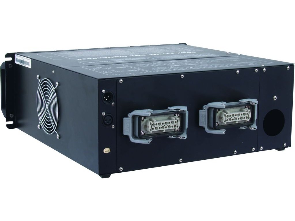 Digitální 12-kanálový DMX stmívač, přístroj nejen pro profesionály, připojení k síti může být provedeno jedno fázově nebo tří fázově, každý kanál s LED kontrolkou stavu a jističem, ovládání možné pomocí dmx nebo analogového signálu, adresování dmx adresy pomocí displeje, možnost nastavení předžhavení na jednotlivých kanálech a také jejich charakteristika (dimmer, switch), ukazatel teploty a aktivní chlazení, vhodné pro instalaci do 19“ racku, maximální zátěž na jeden kanál 16A, celkový přípojný výkon max. 44160W. Výstupy přes multipin konektor.Maximální zatížení: 44160 W