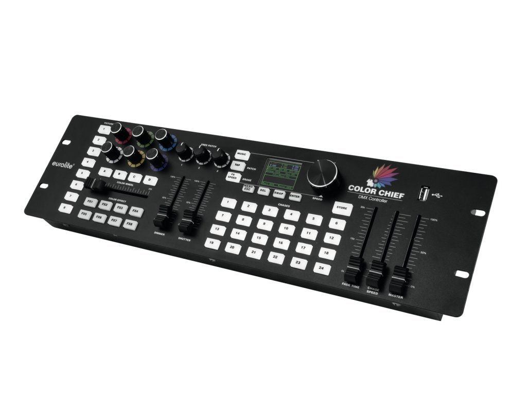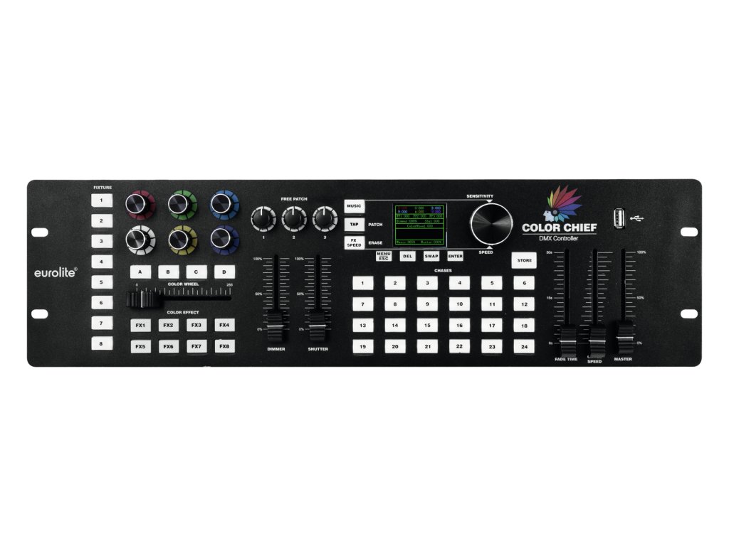 Inovativní ovládání LED světelného parku pomocí stolního DMX kontroléru. Ovládací pult je určený pro řízení LED reflektorů, světelných LED barů a jednoduchých LED světelných paprskových efektů. Určeno pro 8 samostatných světelných efektů nebo světelné KLS rampy se 4 segmenty. Každé zařízení může mít až 30 ovládacích kanálů. Rychlé a snadné programování, některá zařízení Eurolite (např. KLS světelné rampy nebo LED reflektory) jsou již uloženy v knihovně ovladače. Další zařízení lze snadno konfigurovat manuálně. Přímá volba 8 barevných efektů, 3 další kanály jsou k dispozici pro další funkce (např. pro ovládání rotace). 24 paměťových míst pro scény a chasery, které mohou být spuštěny současně. USB port pro ukládání dat programů. Ovládání zvukem pomocí audio signálu nebo manuální spouštění tlačítkem TAP. Master dimmer (stmívání), manuální ovládání rychlosti programu a nastavení jasu svícení. Připojení DMX signálu pomocí 3 pinového konektoru XLR. Aktualizace firmwaru přes USB.Napájení: 100-240V AC, 50/60 Hz