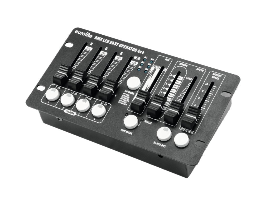 Jednoduchý DMX ovladač pro LED reflektory. Snadné ovládání 4 reflektorů s RGBW LED diodami, které lze ovládat společně nebo individuálně. Oddělené řídící kanály pro jednotlivé barvy (červená, zelená, modrá a bílá) a master. Různé režimy pro volbu barevné sekvence jednotlivých DMX kanálů. Ruční ovládání pomocí 4 tahových potenciometrů, 1 potenciometr pro přímé prolínání RGBW barev. 8 automatických provozních režimů s nastavitelnou rychlostí běhu programu. Ovládání hudbou pomocí zabudovaného mikrofonu s nastavitelnou citlivostí. Strobo efekt s možností změny rychlosti záblesků a funkce Blackout (okamžité vypnutí svícení). Kompaktní DMX ovladač vhodný pro mobilní akce, hudební produkce, taneční kluby a DJe, prezentace, předváděcí akce apod.Napájení: 100-240V AC, 50/60 Hz