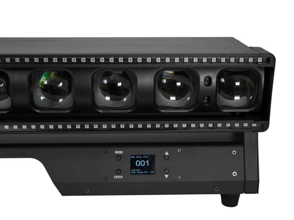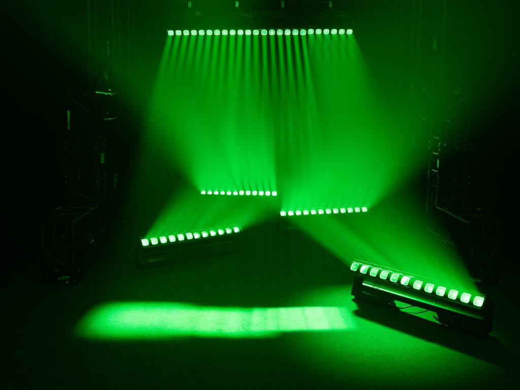 Motorizovaná naklápěcí LED světelná efektová lišta s 12 vysoce výkonnými LED, dvěma rozsahy zoomu od 2° do 28° a 164 efektovými LED 12 výkonných LED 40W 4v1 QCL RGBW (homogenní barevný mix) LED ovládané samostatně 164 výkonných LED 0,2 W SMD 5050 3v1 TCL RGB (homogenní barevný mix) Polohování v rámci 180° NÁKLON Přesné 16bitové rozlišení při stmívání Zoom poháněný motorem Plynulé míchání barev; nastavitelná rychlost programu; barevné animace se dvěma nastavitelnými barvami; křivky stmívání s nastavitelnou odezvou; nastavitelná rychlost stmívání (kroková odezva); variabilní pulzně šířková modulace Efekt paprsku; stroboskopický efekt; efekt svícení nahoru 6 integrovaných show programů Zařízení chlazeno ventilátorem na základně Ovládání samostatně; funkce master/slave; DMX; QuickDMX přes USB (volitelné); W-DMX bezdrátovým řešením přes USB (volitelné); CRMX od LumenRadio přes USB (volitelné); Art-Net; RDM Předprogramováno v Light Captain Bez blikání DMX režim selhání (hold; blackout; auto) S úhlem vyzařování 2° - 28° S úhlem vyzařování 120° S omega držákem Monochromatický LCD displej 4x gumové nožičky Síťový vstup a výstup pro připojení až 8 jednotek Pro oblasti použití jako: Pódium; kluby/taneční školy; svatby/galavečery/akce; restaurace, bary a hotely; divadlo; pronájem Možnosti použití: Stojací; zavěšenéNapájení: 100–240 V AC, 50/60 Hz