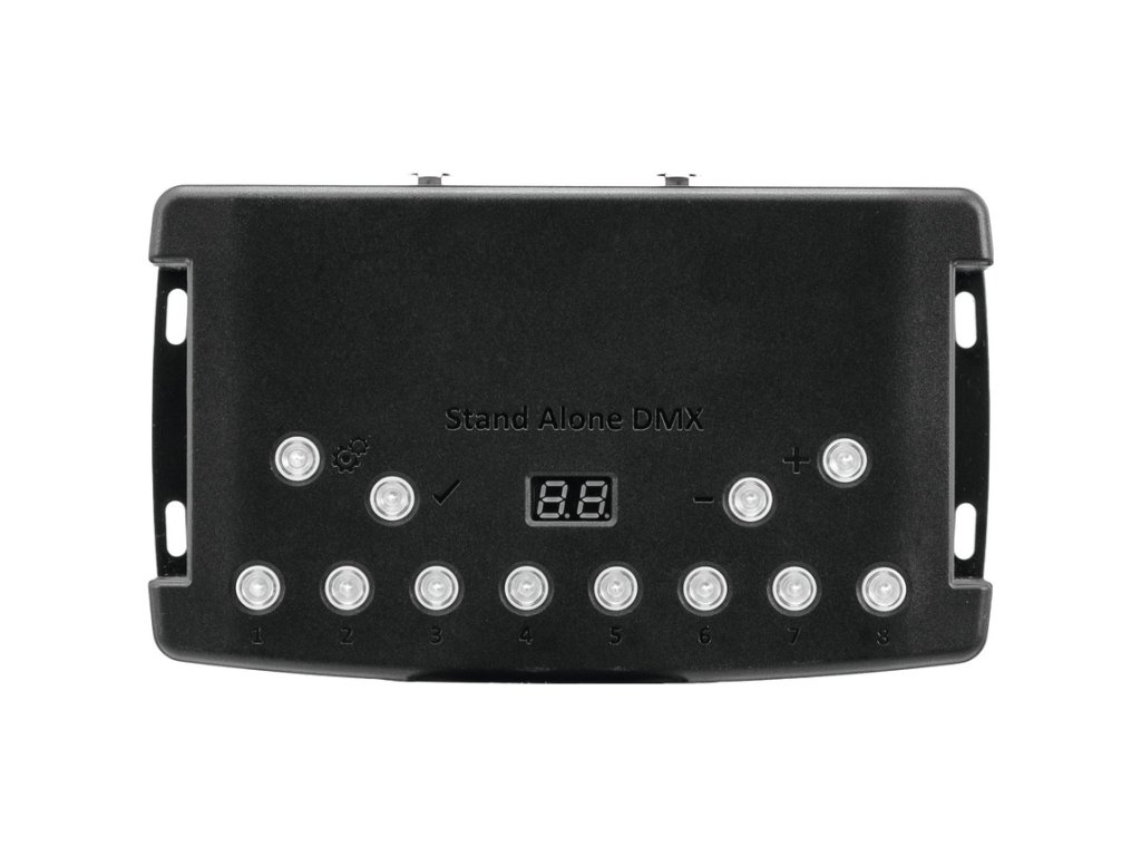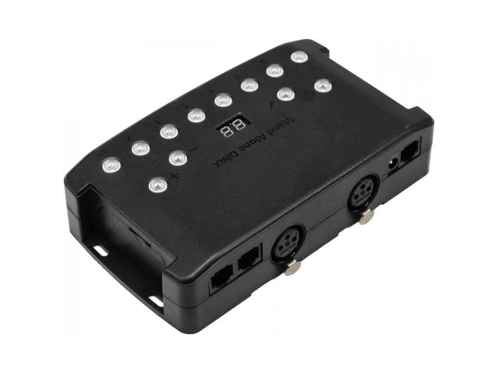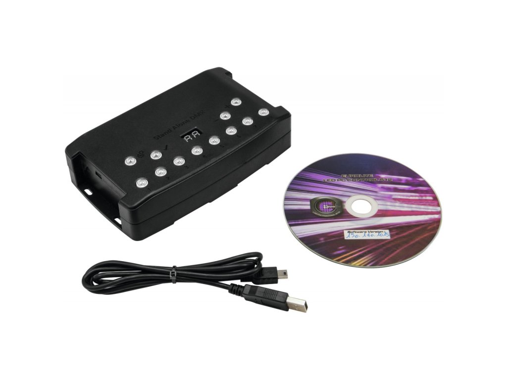 DMX software s možností využití dotykové obrazovky nebo samostatného provozu bez PC. Samostatný standalone kontroler DMX 512 lze používat s počítačem ideálně s dotykovou obrazovkou. Velmi snadno definujete efekty, vytvoříte scény a programy. Má generátor pohybu a barev pro skupiny světel (jako jsou LED pixely). Kontrolér je možné používat i samostatně, programy jen uložíte z PC do paměti kontroléru, následně poté funguje samostatně. Disponuje i možností vložení SD karty pro navýšení interní paměti. Dva výstupy DMX se dají použít jako klonované nebo jako IN/OUT. Možnost upevnění na stěnu.Napájení: 9-36V externě nebo 5V USB