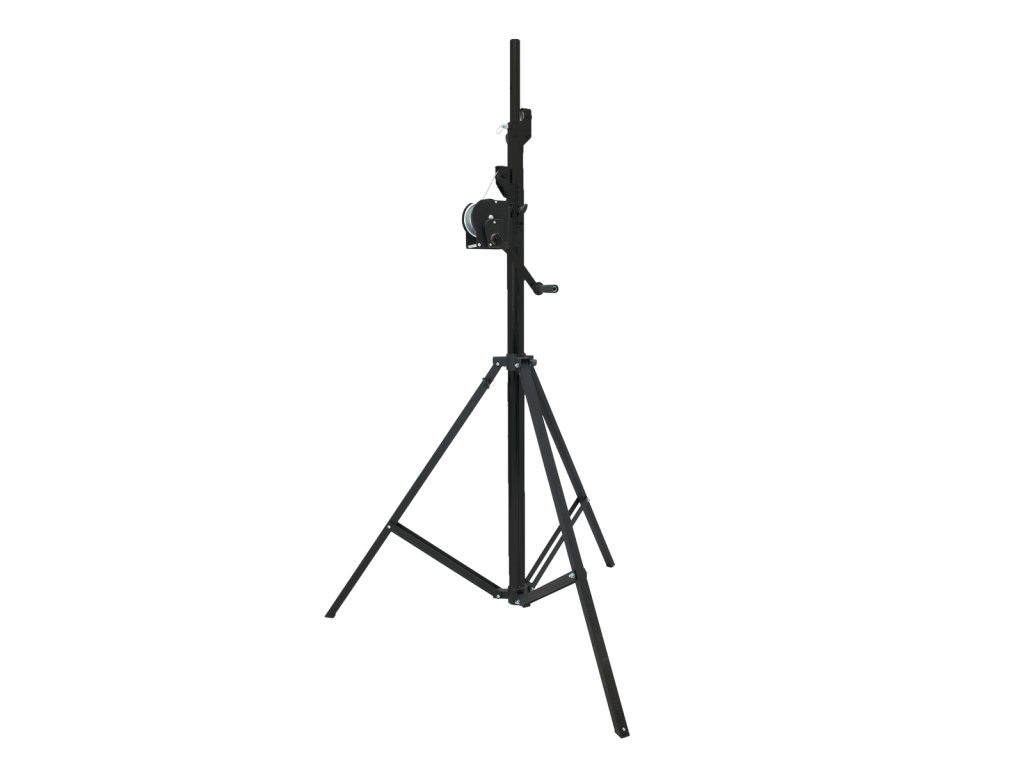 Ocelový stojan s navijákem vhodný pro zvedání hliníkových konstrukcí se světelnými efekty nebo zvukovými PA systémy. 4 mm ocelové lanko, 1 převod pro snadné zvedání nákladu, automatický brzdný systém, bezpečnostní svorka pro mechanické uzamčení nastavené výšky. Maximální výška stojanu 4 metry, maximální nosnost 80 kg, hmotnost 25 kg. Ideální pro mobilní akce. Snadná manipulace i obsluha.Počet sekcí: 3 (60/40/34 mm)