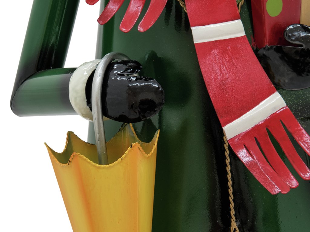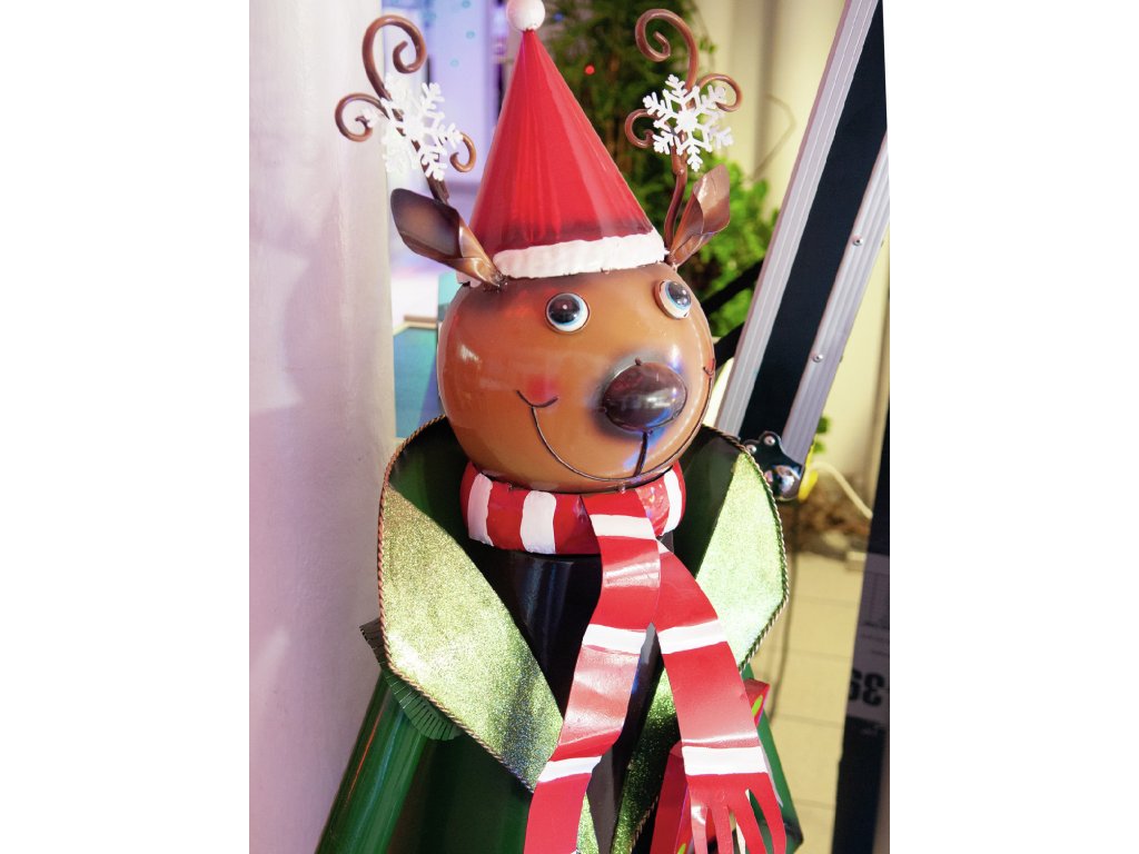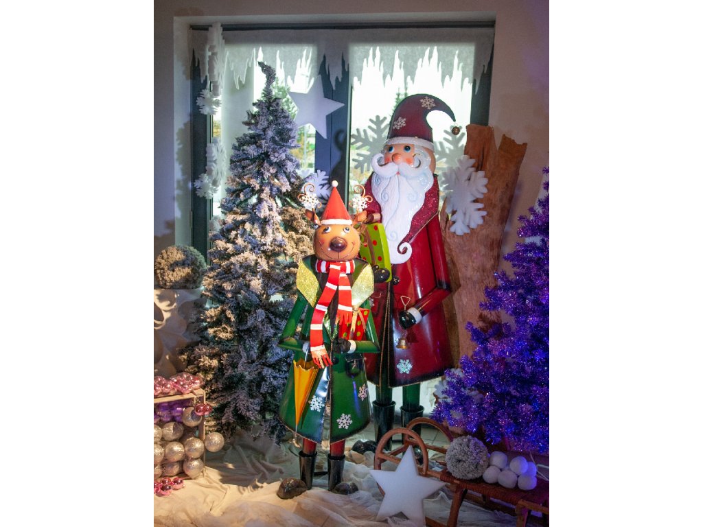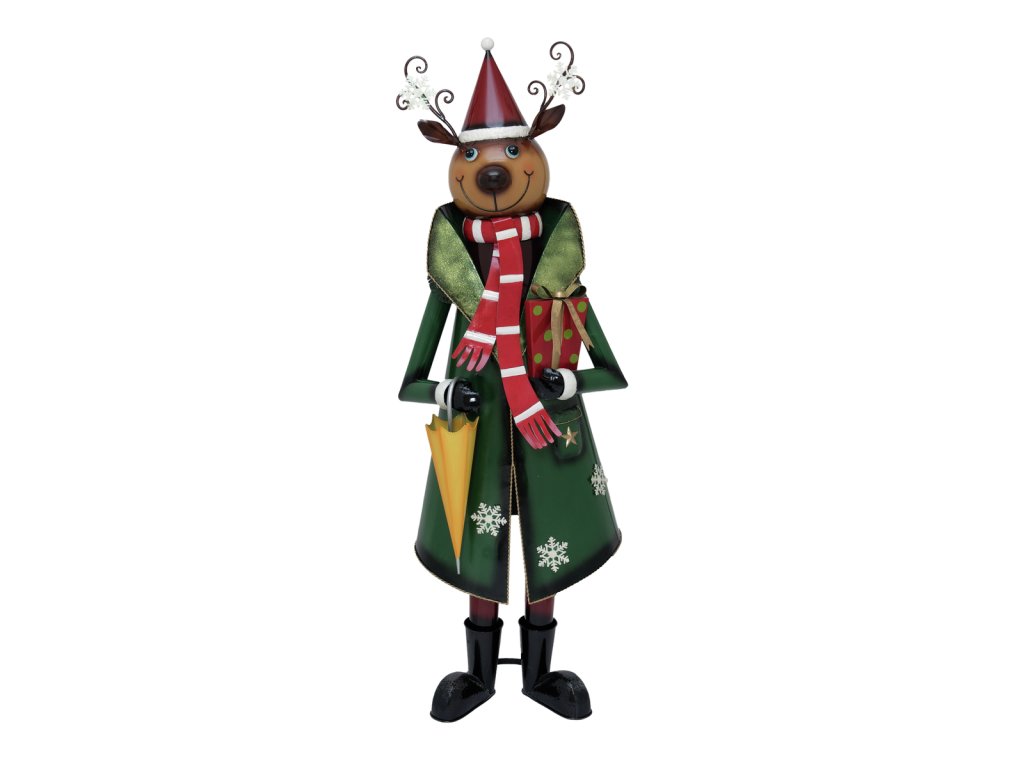Netradiční vánoční dekorace. Sněžný sob „Rudy“ s vánoční čepicí, teplým kabátem, pletenou šálou a deštníkem je perfektně připraven na chladné období. V rukou drží barevný deštník a pečlivě zabalený vánoční dárek. Při dotyku se trup figuríny jemně rozkmitá. Přátelským úsměvem přivítá vaše návštěvníky nebo podpoří produktovou prezentaci vašeho obchodu v předvánoční sezóně. Kovové figuríny v životní velikosti jsou absolutním poutačem vaší zimní nebo vánoční výzdoby. Díky precizní ruční výrobě je každý kus jedinečný. Kvalitní zpracování je patrné zejména na propracovaných detailech. Figurínu lze sestavit v několika jednoduchých krocích. Stabilní základna s kovovým obloukem pro případné upevnění k pevné podložce.Rozměry: 500 x 400 x 1550 mm