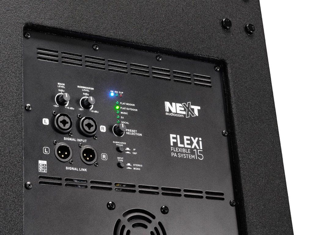 Dva nebo více zařízení Flexi 15 můžete propojit a snadno tak rozšířit svůj systém na opravdu velké profesionální PA. Dva systémy stačí propojit dvojicí kabelů XLR. K tomu slouží dva výstupy Signal Link na Subwooferu. Stejným způsobem můžete k Flexi připojit i jiný systém, nebo z něj zavést signál do nahrávacího zařízení, mixu a dalších aktivních boxů NEXT i jiných značek.