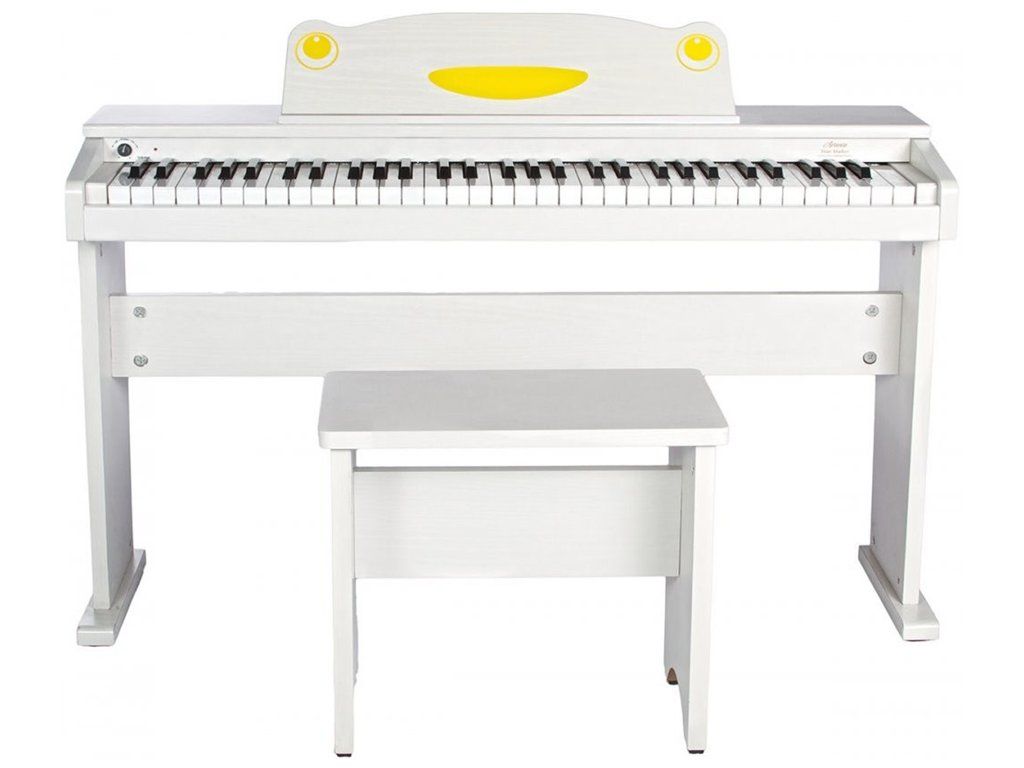 Stylový dětský klavír s odlehčenou dynamickou klaviaturou 61 kláves a zabudovaným ozvučením. Klavírní stolička, sluchátka, sustain pedál, síťový napájecí adaptér, stojan a USB kabel jsou součástí. Povrchová úprava bílá.