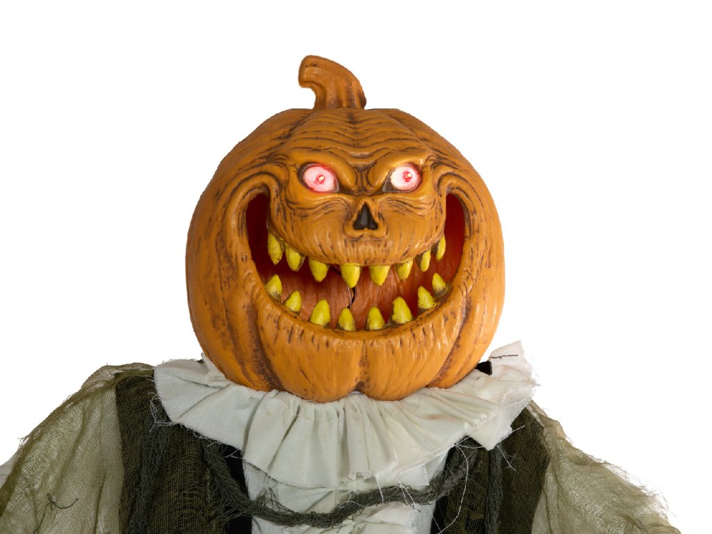 Stále hledáte vhodnou dekoraci pro halloweenskou párty? Stojící figurína dýňového muže je kombinací dýně a zombie s červeně svítícíma LED očima. I když je oblečený do nabírané košile, oblekových kalhot a tílka, neskrývá to jeho příšerné úmysly. Z jeho obří dýňové hlavy s velkými ústy a žlutými špičatými zuby vám tuhne krev v žilách. Pohupuje tělem sem a tam a je slyšet hlasité sténání a vzlyky. Jeho paže s nadměrně velkýma kostěnýma rukama lze snadno ohnout do požadovaného tvaru. Animace postavy se aktivuje vestavěným mikrofonem nebo kabelovým ručním ovládáním. Před uvedením do provozu zajistěte dostatečnou vzdálenost od ostatních objektů, protože figurína se pohybuje nepravidelně.Baterie: 3 x Mignon (AA, není součástí balení)