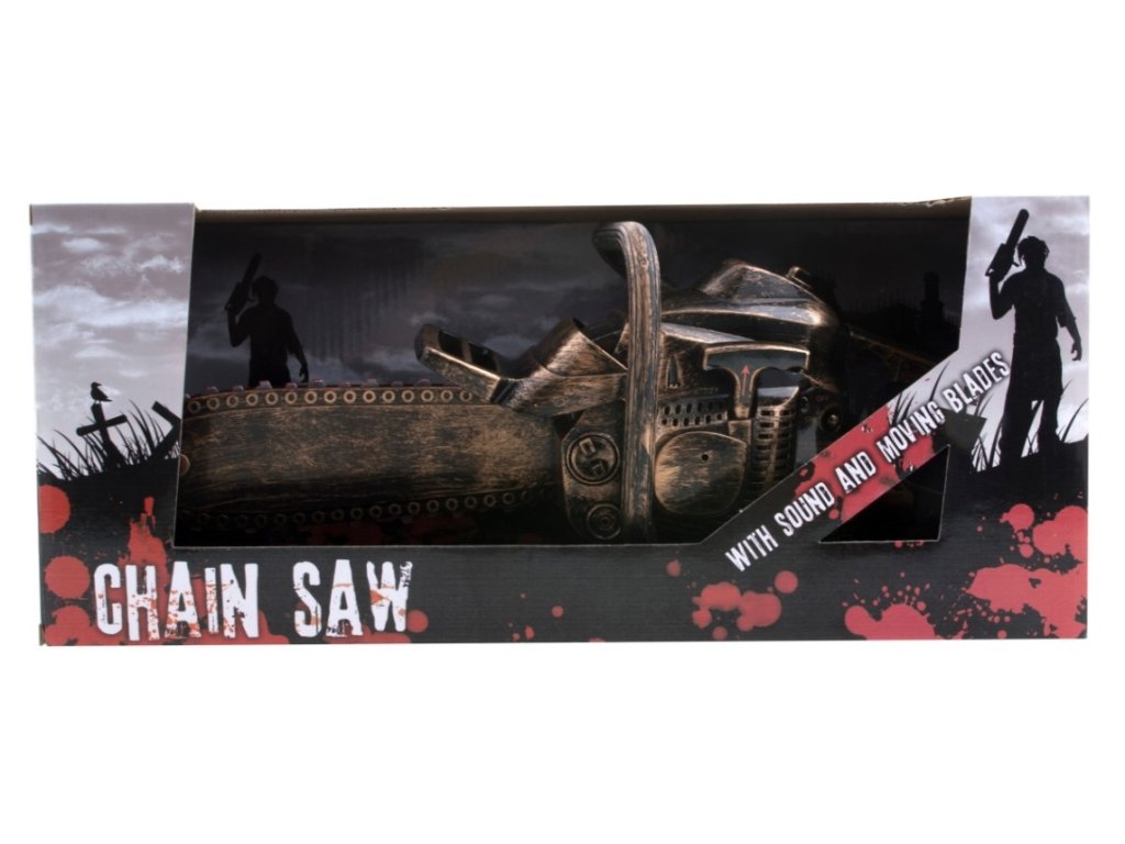 Halloween motorová pila s pohybujícím se řetězem, zvukovými efekty a LED osvětlením je napájena tužkovými bateriemi (3x AA, baterie nejsou součástí dodávky).Materiál: PVC