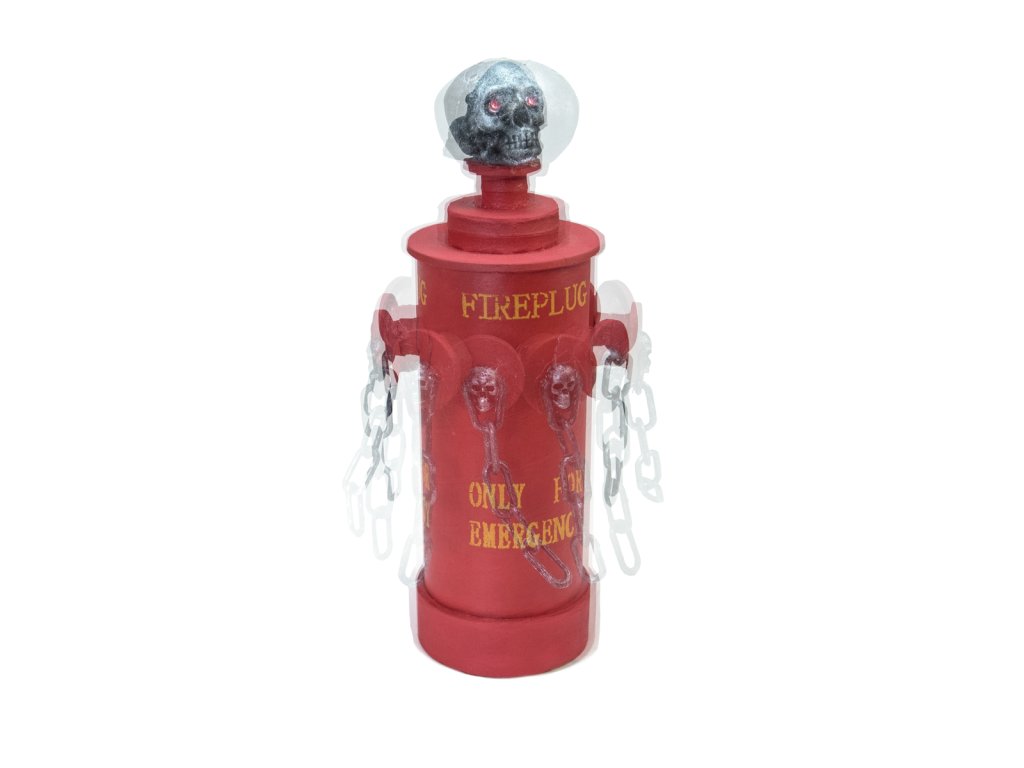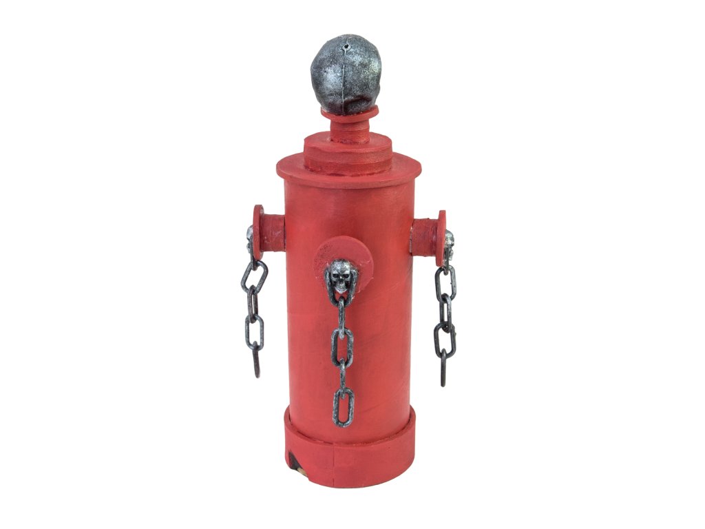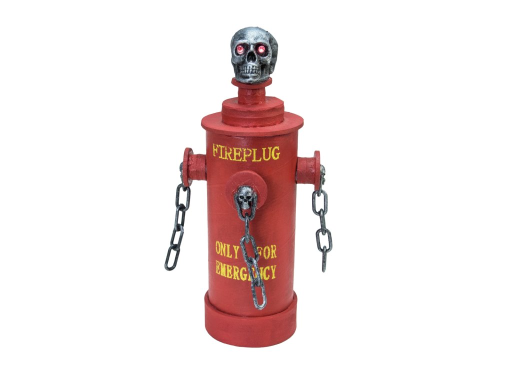 Halloween požární hydrant s animacemi. Na vrcholu hydrantu je posazená lebka, které při spuštěné animaci blikají oči. Hydrant se třese a vydává hrůzostrašný smích, který nikoho nenechá klidným. Spuštění animace pomocí zabudovaného mikrofonu, délka animace cca. 12 sekund, napájení bateriemi (2x AA), rozměry 28 x 13 x 13 cm. Při požáru tento hydrant hasičům asi moc nepomůže, ale na Halloween párty snadno vytvoří strašidelnou atmosféru.Napájení: 2x AA baterie
