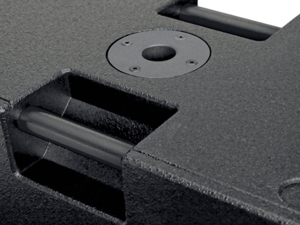 Model HFA112s je na horní straně vybaven osazením pro reproduktorovou tyč 35 mm. Tak můžete celopásmový pasivní reprobox umístit přímo na subwoofer, aniž byste používali reproduktorový stojan.