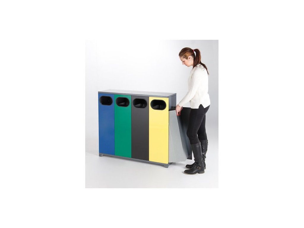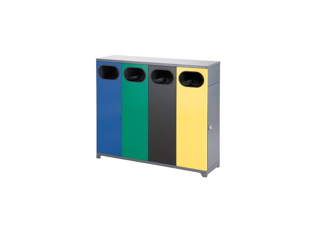 Interiérový čtyř-koš na tříděný odpad - tloušťka materiálu 1 mm. Vyrobeno z kvalitního pozinkovaného plechu. Vyráběno z materiálů s tloušťkou 1 mm jako interiérové a s tloušťkou 2 mm jako exteriérové provedení. Vybaveno vyjímatelnými vložkami z pozinkovaného plechu o objemu 40 l. Vložky jsou vyjímatelné bočními dvířky opatřenými zámkem. Koš je vybaven bočními dvířky se zámkem na obou stranách. Vhozy jsou opatřeny bezpečnostní gumou. Povrchová úprava vyhotovena práškovou barvou.Doplňkové parametry