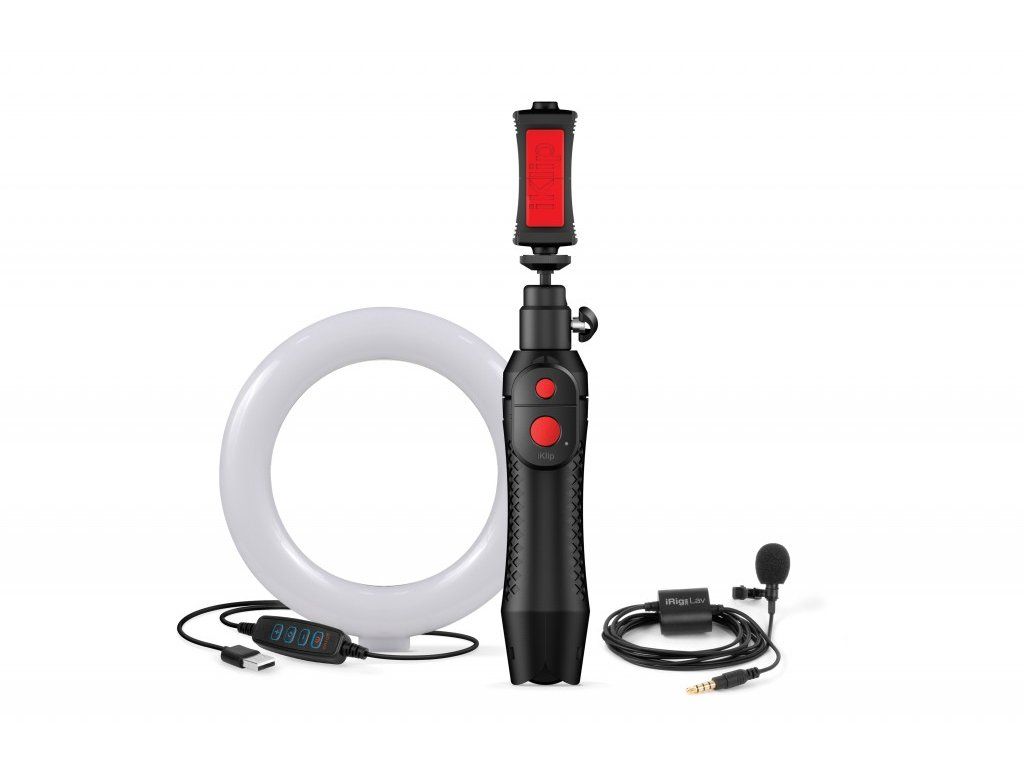 Balíček IK Multimedia iRig Video Creator je zařízení typu all-in-one, díky kterému vytvoříte záznamy videa s ohromujícím zvukem a skvělými světelnými podmínkami a to pouze za pomocí vašeho chytrého telefonu. Tento balíček je ideální uprgrade pro začínající vloggery, YouTubery a live streamy. Obsahuje klipový klopový mikrofon iRig Mic Lav, multifunkční stojan iKlip Grip Pro a 6 palcový LED USB světelný kruh.