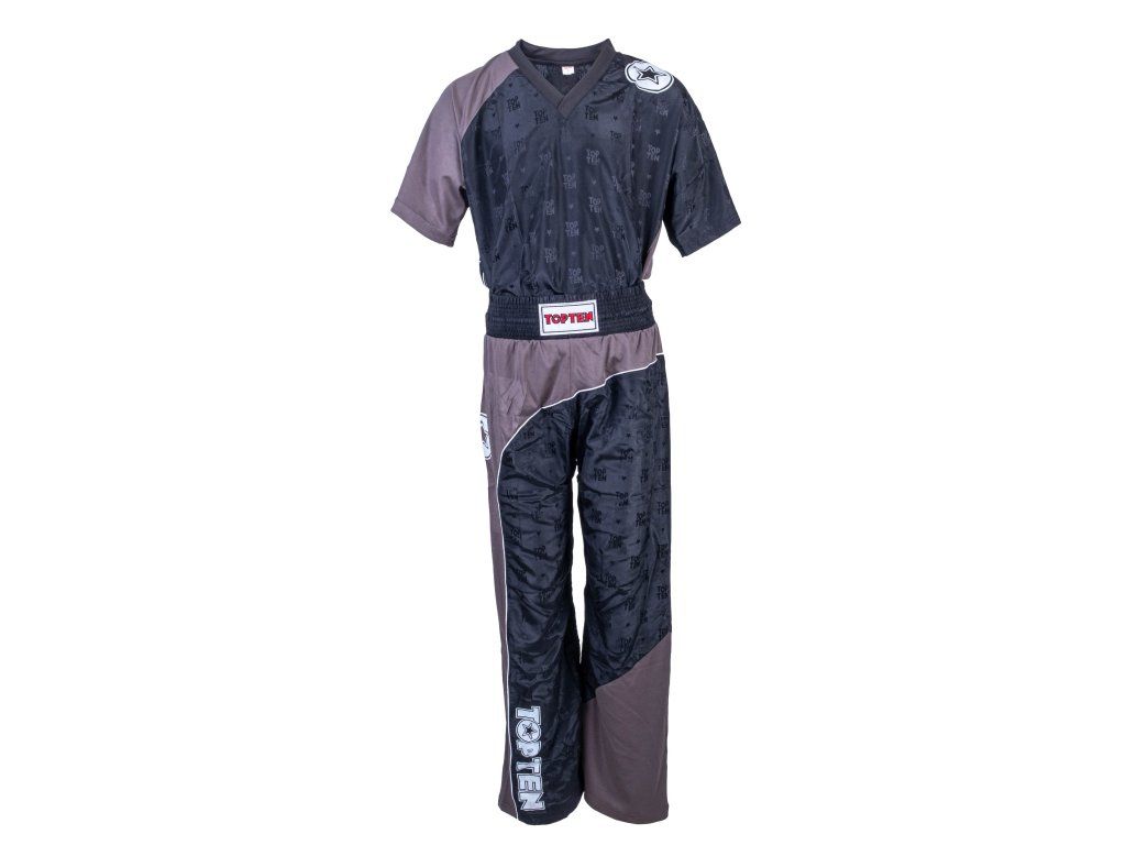 Kickbox uniforma Bow - černá/šedá Kickboxerská uniforma „Bow“ od TOP TEN je vyrobena výhradně z ultralehkého syntetického vlákna a je sportovní a uvolněná. Skládající se z dlouhých kalhot a krátkého trika. Látka se vyznačuje plně tkanou strukturou TOP TEN a je k dispozici celkem v 7 různých provedeních. Barvy a tiskové motivy byly sublimovány do látky, která se přímo odpařuje. Kickboxerská uniforma „Bow“ je odolná vůči vnějším vlivům prostředí a přesto zůstává plně prodyšná. Košile s kontrastním černým výstřihem do V nabízí optimální volnost pohybu. Kalhoty uniformy jsou protiskluzové díky širokému a elastickému pasu. lehké syntetické vlákno tkaná struktura TOP TEN četné barevné varianty dodatečné síťové aplikaceDoplňkové parametry