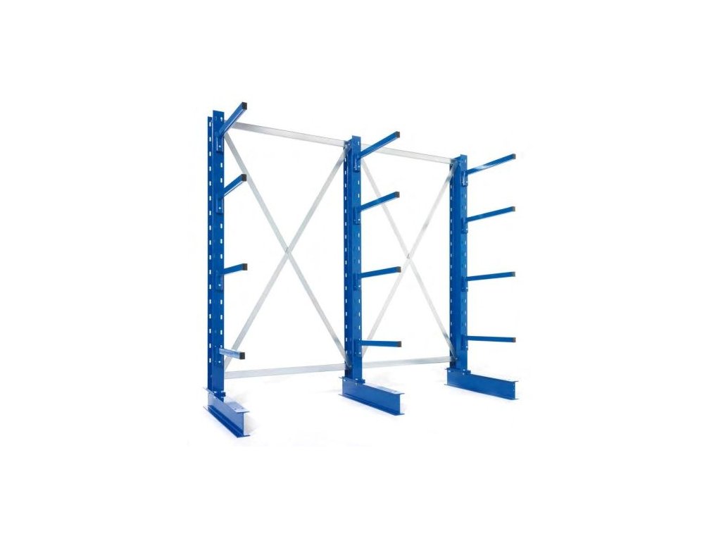 Počet ramen: 4 Počet stojin: 1 Nosnost ramene: 140 kg Vyrobeno z lakované oceli. Konzolové regály slouží pro skladování dlouhých předmětů, jako jsou trubky, latě, desky, tyče, apod. Stojiny regálu jsou vyrobeny z oboustranně děrovaných ocelových profilů. Oboustranné děrování pro možnou budoucí přestavbu z jednostranného provedení na oboustranné. Děrování slouží pro zasouvání jednotlivých ramen. Ramena jsou zajištěna proti vyháknutí zajišťovacím šroubem. Ramena jsou výškově stavitelná v rastru 100 mm. Osová vzdálenost mezi jednotlivými stojinami je 1330 mm. Regály lze rozšiřovat o přístavbové pole, které jsou dodávané včetně ramen a výztuh.Doplňkové parametry