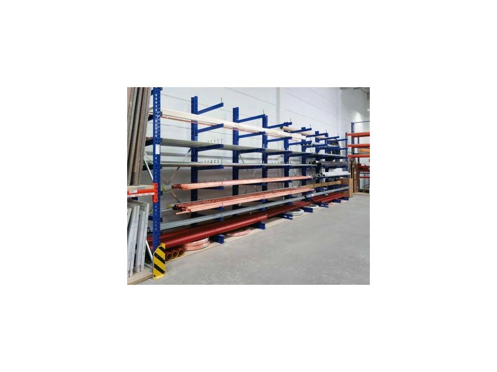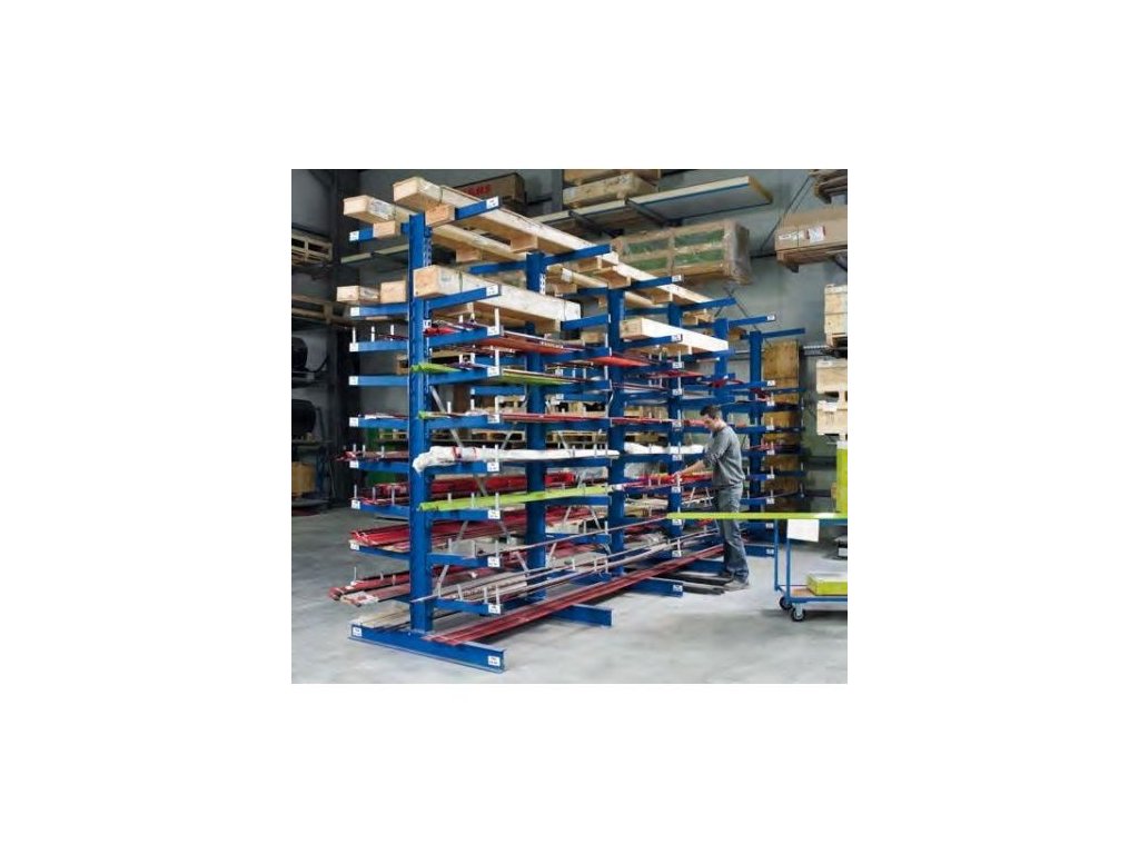 Počet ramen: 5 Počet stojin: 2 Nosnost ramene: 535 kg Vyrobeno z lakované oceli. Konzolové regály slouží pro skladování dlouhých předmětů, jako jsou trubky, latě, desky, tyče, apod. Stojiny regálu jsou vyrobeny z oboustranně děrovaných ocelových profilů. Oboustranné děrování pro možnou budoucí přestavbu z jednostranného provedení na oboustranné. Děrování slouží pro zasouvání jednotlivých ramen. Ramena jsou zajištěna proti vyháknutí zajišťovacím šroubem. Ramena jsou výškově stavitelná v rastru 100 mm. Osová vzdálenost mezi jednotlivými stojinami je 1330 mm. Regály lze rozšiřovat o přístavbové pole, které jsou dodávané včetně ramen a výztuh.Doplňkové parametry
