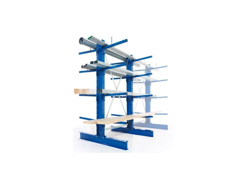 Počet ramen: 8 Počet stojin: 2 Nosnost ramene: 140 kg Vyrobeno z lakované oceli. Konzolové regály slouží pro skladování dlouhých předmětů, jako jsou trubky, latě, desky, tyče, apod. Stojiny regálu jsou vyrobeny z oboustranně děrovaných ocelových profilů. Oboustranné děrování pro možnou budoucí přestavbu z jednostranného provedení na oboustranné. Děrování slouží pro zasouvání jednotlivých ramen. Ramena jsou zajištěna proti vyháknutí zajišťovacím šroubem. Ramena jsou výškově stavitelná v rastru 100 mm. Osová vzdálenost mezi jednotlivými stojinami je 1330 mm. Regály lze rozšiřovat o přístavbové pole, které jsou dodávané včetně ramen a výztuh.Doplňkové parametry