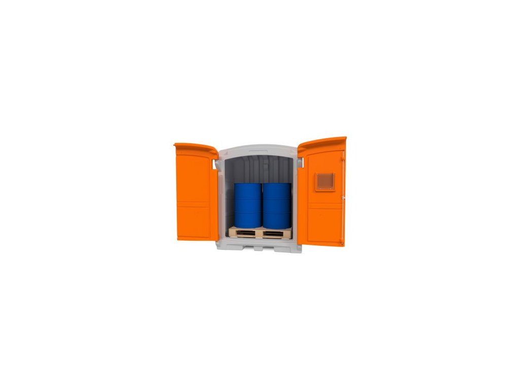 Vyrobeno z vysoce odolného polyetylenu. Vysoká chemická odolnost materiálu. Uzamykatelná dvířka s držákem na dokumentaci na vnitřní straně dvířek. Integrované prolisy pro vidlice vysokozdvižného vozíku. Provedení pro uskladnění 2x 200 l sudů na EURO paletách (1200 x 800 mm). Pro přímé uskladnění sudů bez použití palety je možné vanu vybavit plastovým nebo ocelovým roštem (není součástí). Krytá záchytná vana je vybavena dvířky s možností otevření do 270°. V případě postavení krytých záchytných van do řady lze dvířka otevřít do 180°. Dvířka lze uzavírat krokově po 90°. V horní částí dvířek je integrován svod dešťové vody. Klenutá střecha odolává vyššímu zatížení sněhem.Doplňkové parametry