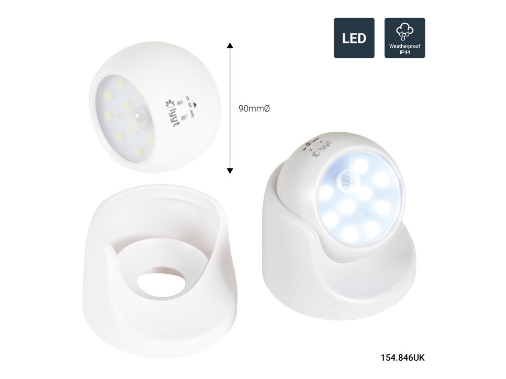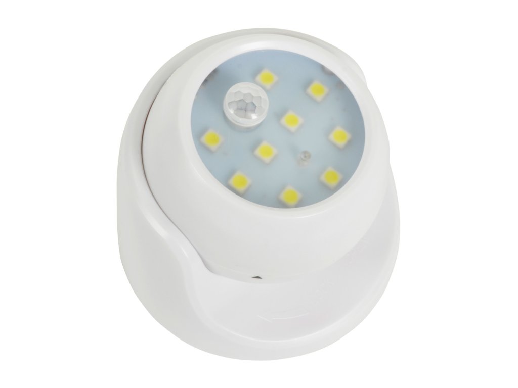 Bezdrátové, kompaktní a jasné LED světlo ( (9x SMD LED) s pohybovým senzorem, napájené bateriemi (3x AAA - nejsou součástí dodávky). Pohybový senzor poskytuje pokrytí 120° na vzdálenost až 3 m a spouští jasné LED světlo i v noci, takže je ideální pro menší, kryté prostory, jako jsou kůlny, garáže, půdy a karavany. Světlo lze vyjmout z držáku, takže ho lze v případě potřeby použít jako svítilnu. 360° otočná hlava, IP20 krytí - určeno pouze pro vnitřní nebo kryté venkovní použití. Barva bílá.Napájení: 3x AAA baterie (nejsou součástí balení)