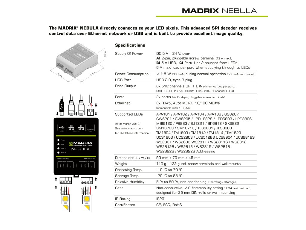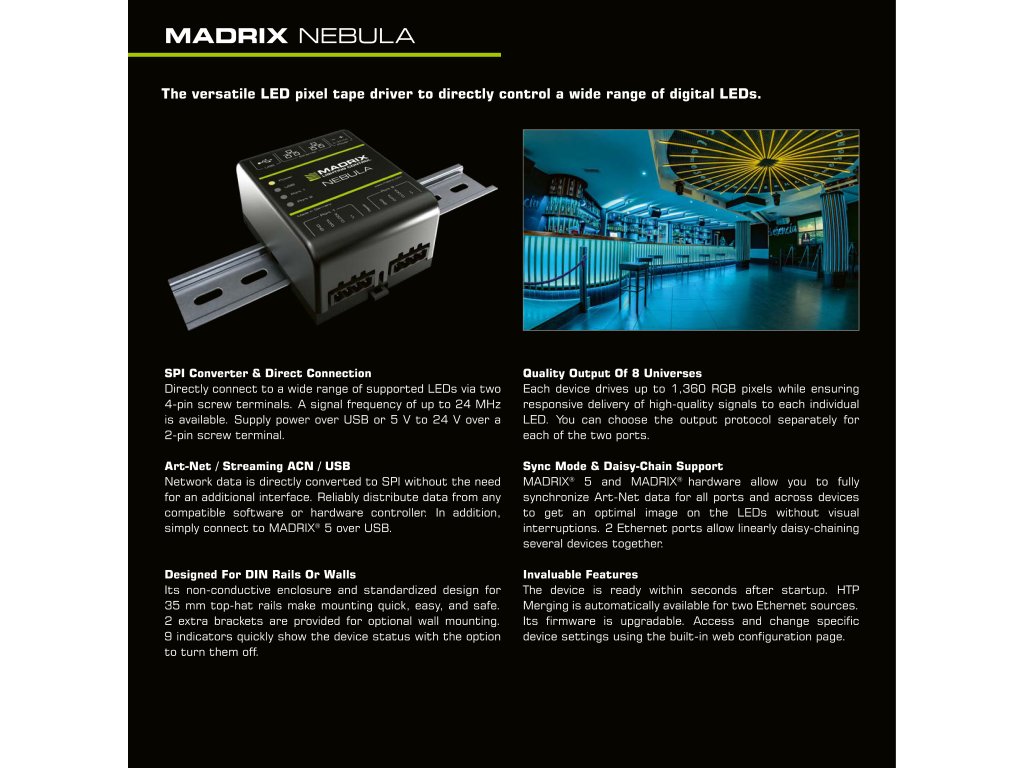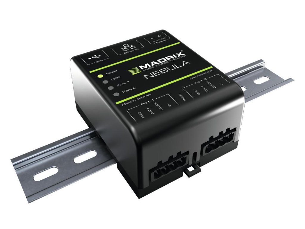 Převodník USB a Artnet pro ovládání pixelů v LED páskách, jednotlivých LED pixel bodů a zařízení s SPI čipy. MADRIX NEBULA je HW převodník který podporuje širokou škálu LED čipů: APA101 / APA102 / APA104 / APA106 / GS8207 / GW6201 / GW6205 / LPD1882S / LPD6803 / LPD8806 / MBI6120 / P9883 / SJ1221 / SK6812 / SK6822 / SM16703 / SM16716 / TLS3001 / TLS3008 / TM1804 / TM1809 / TM1812 / TM1814 / TM1829 / UCS1903 / UCS2903 / UCS512B3 / UCS8904 / UCS9812S / WS2801 / WS2803 / WS2811 / WS2811S / WS2812 / WS2812B / WS2813 / WS2815 / WS2818 / WS2822S / WS2822S (březen 2019 ú aktualizují se i nové pomocí firmware update) Jedno zařízení dokáže ovládat až 1360 RGB pixelů (8 DMX skupin / 4096 DMX kanálů / 4096 jednobarevných pixelů / 1024 RGBW pixelů) které řídí pomocí 2 sběrnic na výstupu. Podporuje signálové frekvence až 24MHz. Výstupní protokol může být na každé sběrnici jiný. LED čipy připojujete k zařízení NEBULA pomocí dvou 4 pinových šroubkových terminálů. Máte k dispozici i dvě varianty napájení zařízení: přes USB port (5 V) nebo přes šroubkový terminál (5 V to 24 V / 12 A) tímto portem lze přes NEBULA napájet i LED čipy do max. 6A/sběrnice. Zařízení disponuje dvěma Ethernetovými konektory a lze jej tedy použít i v řetězu bez nutnosti mít router. (protokoly Art-Net and/or Streaming ACN). Též jej lze připojit ke kontrolnímu PC pomocí USB2 kabelu jako převodník. Se software MADRIX pracuje skvěle, doporučuje se i na velké projekty ve vysokých počtech bez problémů se synchronizací, rychlá a snadná instalace. Díky oficiálnímu protokolu Art-Net, kterým zařízení komunikuje, jej lze připojit i k zařízením jiných výrobců - konzole, software apod. Automaticky slučuje více ethernetových zdrojů pomocí HTP. Nejen pomocí software, ale též i přes vestavěné webový prohlížeč, můžete snadno konfigurovat kanály ve skupině, offset nastavení, nastavení v případě ztráty signálu apod. indikační LED diody - 9ks, lze je i vypnout v případě diskrétní instalace. Nebula je vyrobena pro snadné nacvaknutí na 35mm DIN lišty nebo nástěnné držáky. neinduktivní tělo s IP20 krytím,standard nehořlavosti UL94 V-O bezventilátorový, bezhlučný a nízkoenergetický design. Po připojení napájení do pár vteřin připraveno k užívání. doporučeno pro malé i velké projekty, skvělá synchronizace pokud použijete více zařízení pohromadě. více informací: www.madrix.cz. Vyrobeno v NěmeckuPower supply: 5-24 V DC