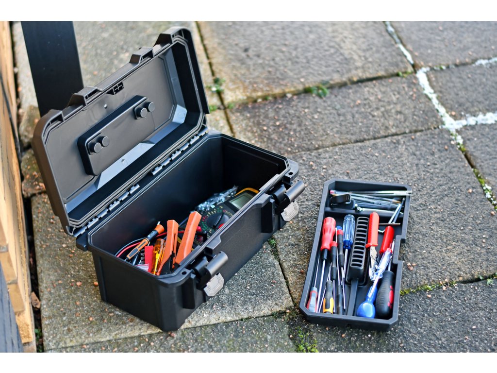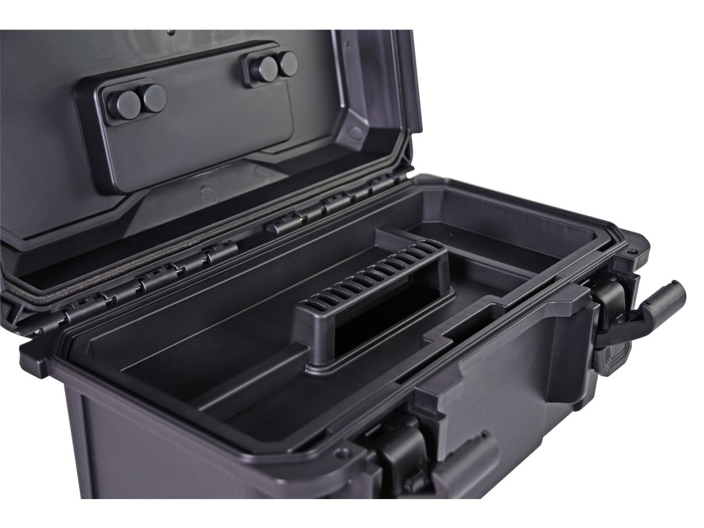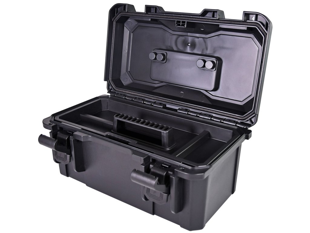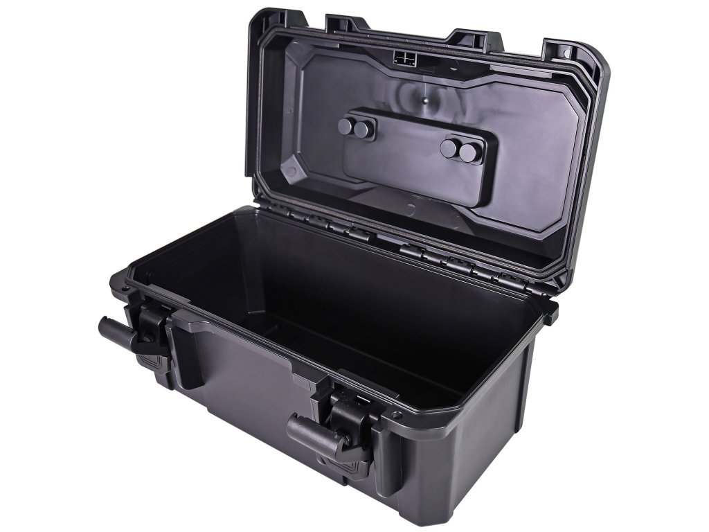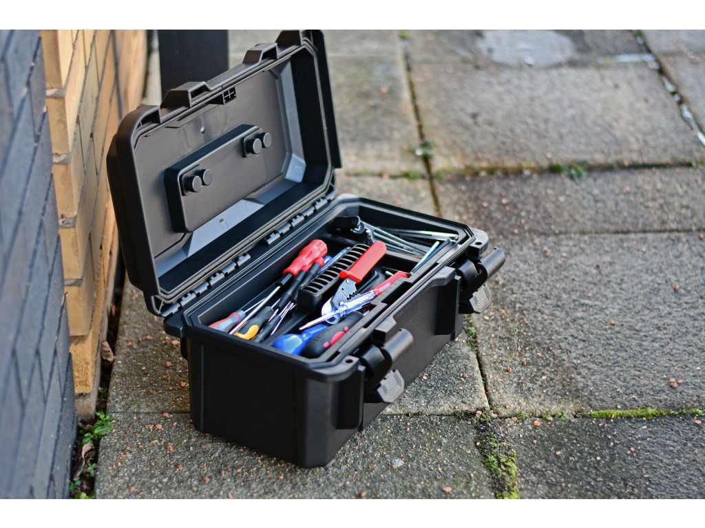 Odolný kufr vyrobený z 4 mm nárazuvzdorného polypropylenu s pogumovanou rukojetí, výklopným víkem a vyjímatelnou poličkou. Zajišťovací západky a průchozí otvory pro přidání visacích zámků pomáhají udržet vybavení uvnitř v bezpečí. Těsnění víka zajišťuje kufru vodotěsnost díky krytí IP67. Díky vysoké odolnosti proti nárazu poskytuje kufr nejvyšší možnou ochranu nářadí nebo jiným vloženým předmětům.Konstrukce: vstřikovaný polypropylen