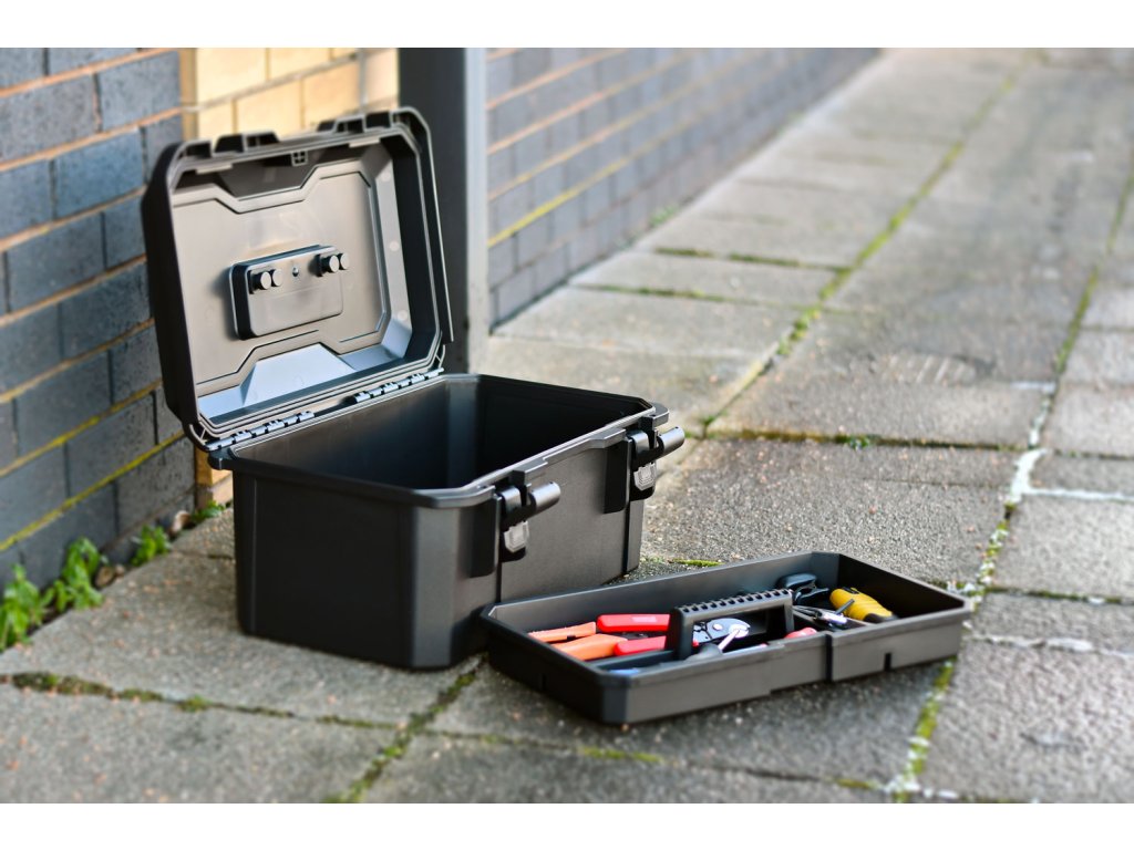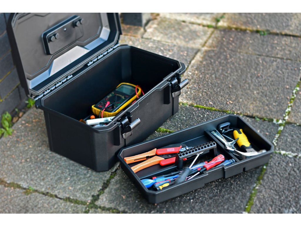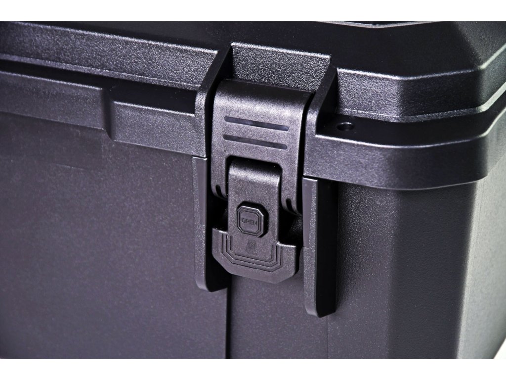 Odolný kufr vyrobený z 4 mm nárazuvzdorného polypropylenu s pogumovanou rukojetí, výklopným víkem a vyjímatelnou poličkou. Zajišťovací západky a průchozí otvory pro přidání visacích zámků pomáhají udržet vybavení uvnitř v bezpečí. Těsnění víka zajišťuje kufru vodotěsnost díky krytí IP67. Díky vysoké odolnosti proti nárazu poskytuje kufr nejvyšší možnou ochranu nářadí nebo jiným vloženým předmětům.Konstrukce: vstřikovaný polypropylen
