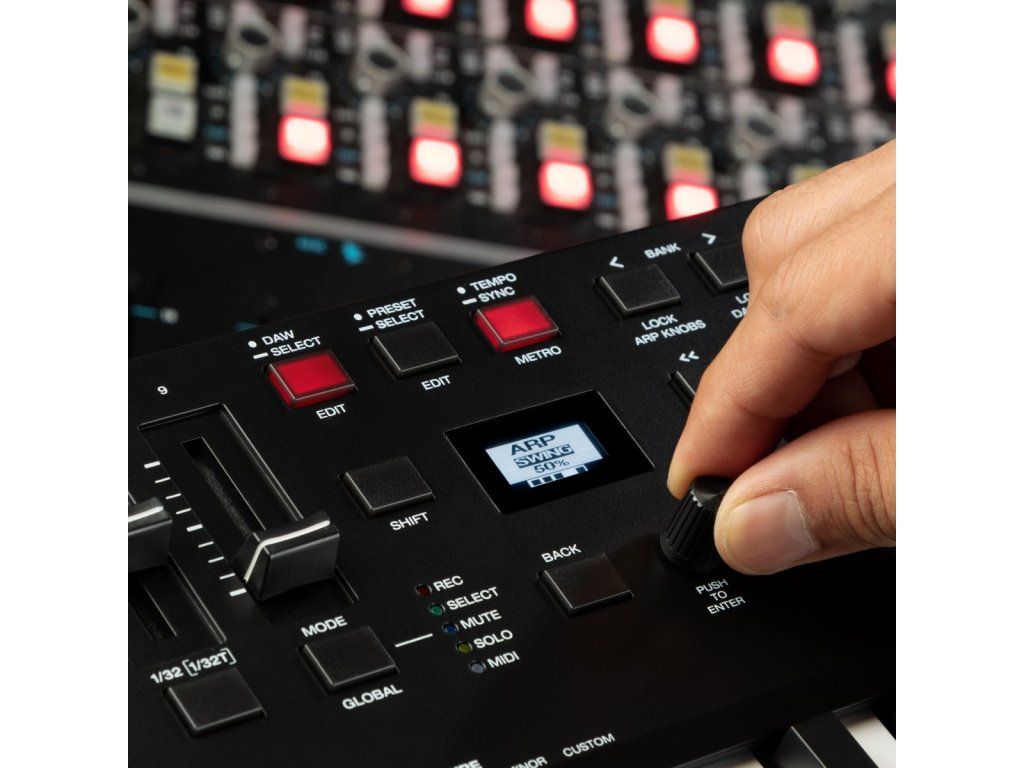 Díky 16 RGB padům s funkcí Note Repeat, Smart Scale a Smart Chord je tvorba harmonie i rytmu rychlá a intuitivní. Arpeggiátor umožňuje definovat typ, oktávový rozsah, délku a swing pro kreativní patterny. OLED displej zajišťuje pohodlné nastavení parametrů.