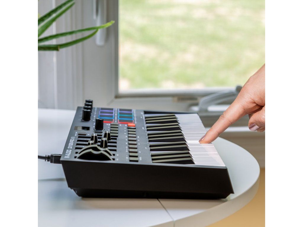 Kompaktní a výkonná USB MIDI klaviatura se 32 dynamickými mini klávesami, 8 podsvícenými pady a technologií Smart Chord a Smart Scale pro kreativní tvorbu. Nabízí plnou integraci s DAW díky auto-mappingu a pokročilému arpeggiátoru. Klaviatura je ideální pro mobilní produkci, domácí studio i živé vystupování. Nechybí OLED displej, čtyři fadery a otočné ovladače, ergonomické kolečka pro pitch a modulaci a navíc možnost MIDI výstupu pro externí zařízení. Kompatibilní s macOS, Windows a softwarovými standardy AU/VST.