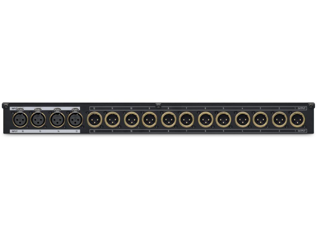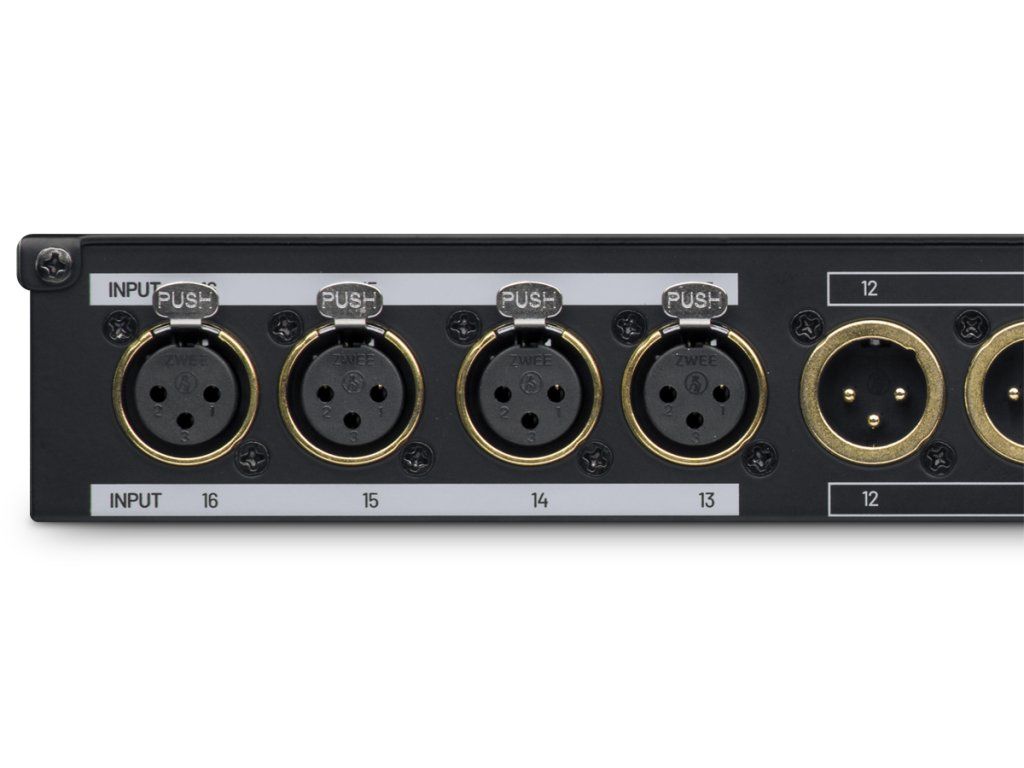 Na zadním panelu se logicky nacházejí opačné konektory s označením INPUT/OUTPUT. Prvních dvanáct je typu XLR male a lze z nich odebírat signál z předních vstupů. Zbylé čtyři jsou typu XLR male a přivádí se na ně signál z výstupů připojených zařízení.