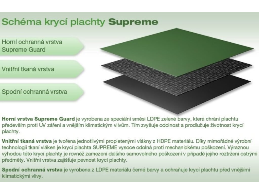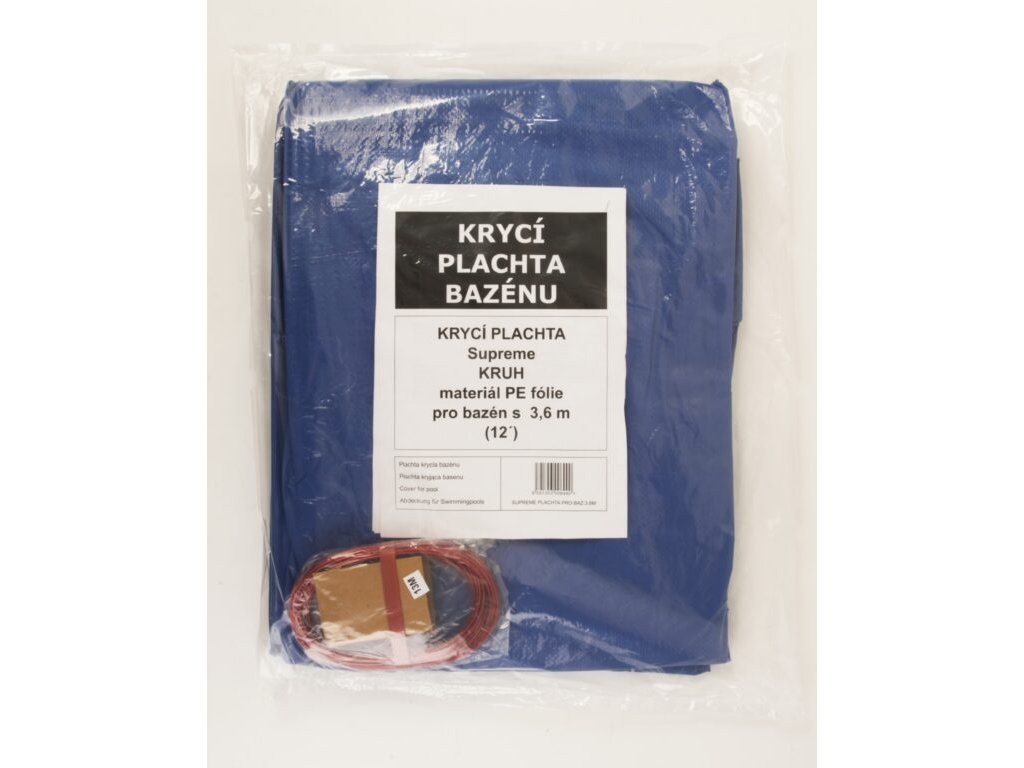 Pro období, kdy není bazén používán, doporučujeme zakrytí krycí plachtou. Zamezíte tím vnikání mechanických nečistot např. listí, hmyzu nebo pylu do vašeho bazénu. Díky použití ochranné vrstvy Supreme Guard je krycí plachta Supreme pevnější a lépe odolává povětrnostním vlivům – nejedná se ale o zimní plachtu a používání při teplotách pod bodem mrazu životnost krycí plachty snižuje. Barva krycí plachty je zelenočerná. K bazénu ji snadno a rychle uchytíte pomocí lanka a napínáku s ráčnou. Ocelové lanko potažené plastovou ochrannou vrstvou i napínák s ráčnou jsou součástí balení.