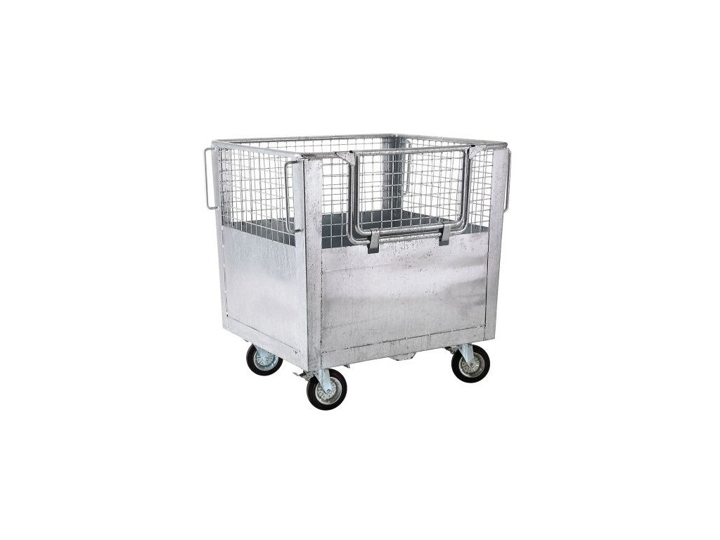 Žárově zinkovaná konstrukce. Vrchní část nádoby je síťovaná, dno je plné. Opatřeno horní otevírací částí se zajištěním. Vybaveno 4 otočnými kolečky o průměru 200 mm. Dvě kolečka jsou vybavena brzdou. Integrovaná madla na bocích pro snazší manipulaci.Doplňkové parametry