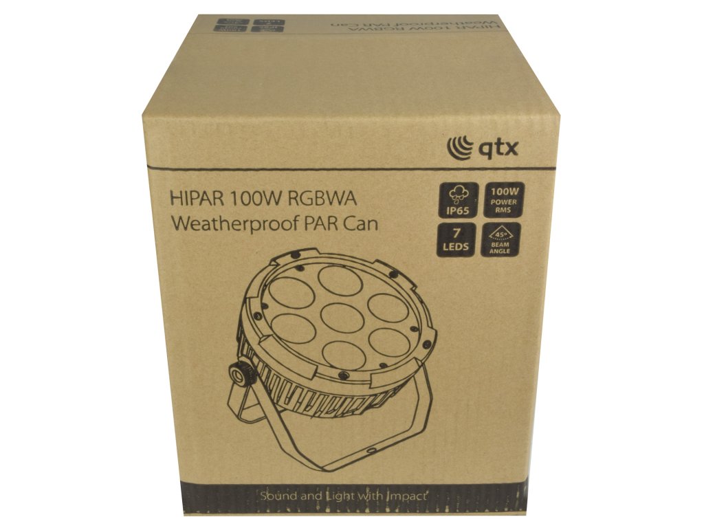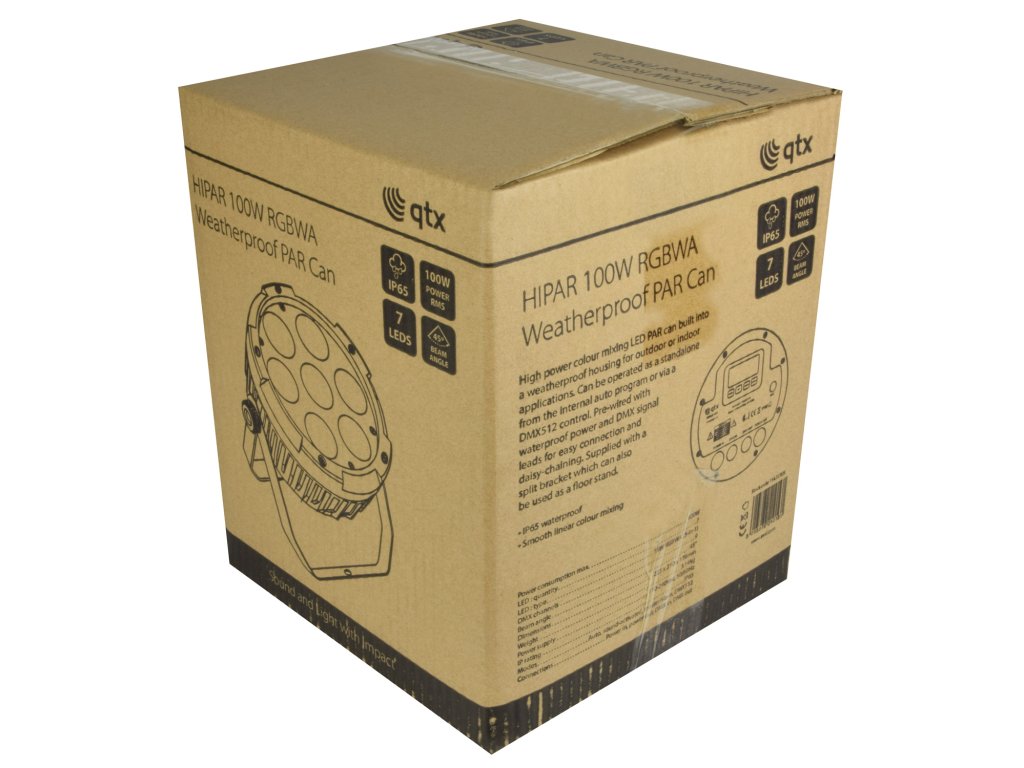 QTX LED PAR reflektor s IP65 krytím je osazený 7x 15W LED (5v1)- RGBWA LED s vyzařovacím úhlem 45°. Každou barvu lze ovládat samostatně. Funkce RGBAW míchání barev, stmívače, Strobo-efektu a ovládání DMX signálem (5 a 9) pomocí libovolného standardního DMX ovladače. Režim Stand-Alone s funkcí Master/Slave, vestavěný mikrofon pro ovládání hudbou nebo použití předprogramovaných scén. Nastavení rychlosti běhu automatických provozních režimu a přiřazení DMX adres pomocí ovládacího panelu se čtyřmi tlačítky.Napájení: 100-240V, 50/60 Hz