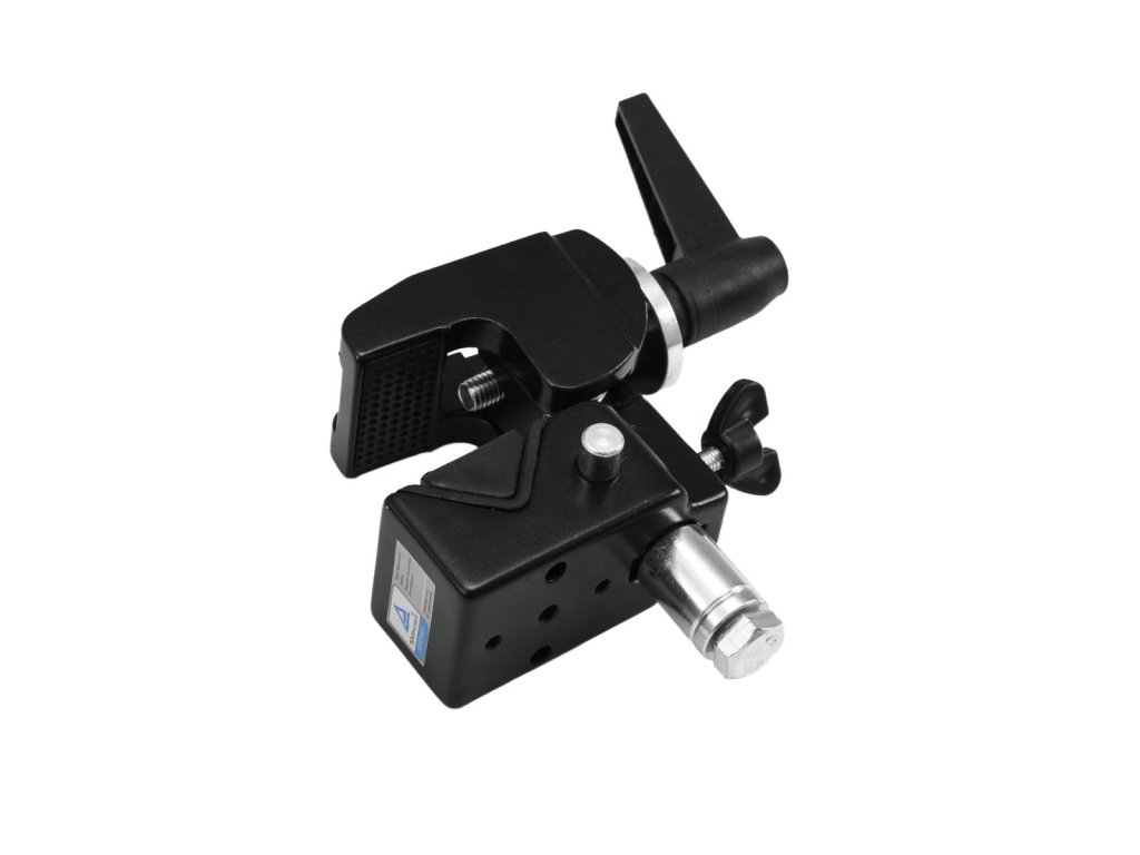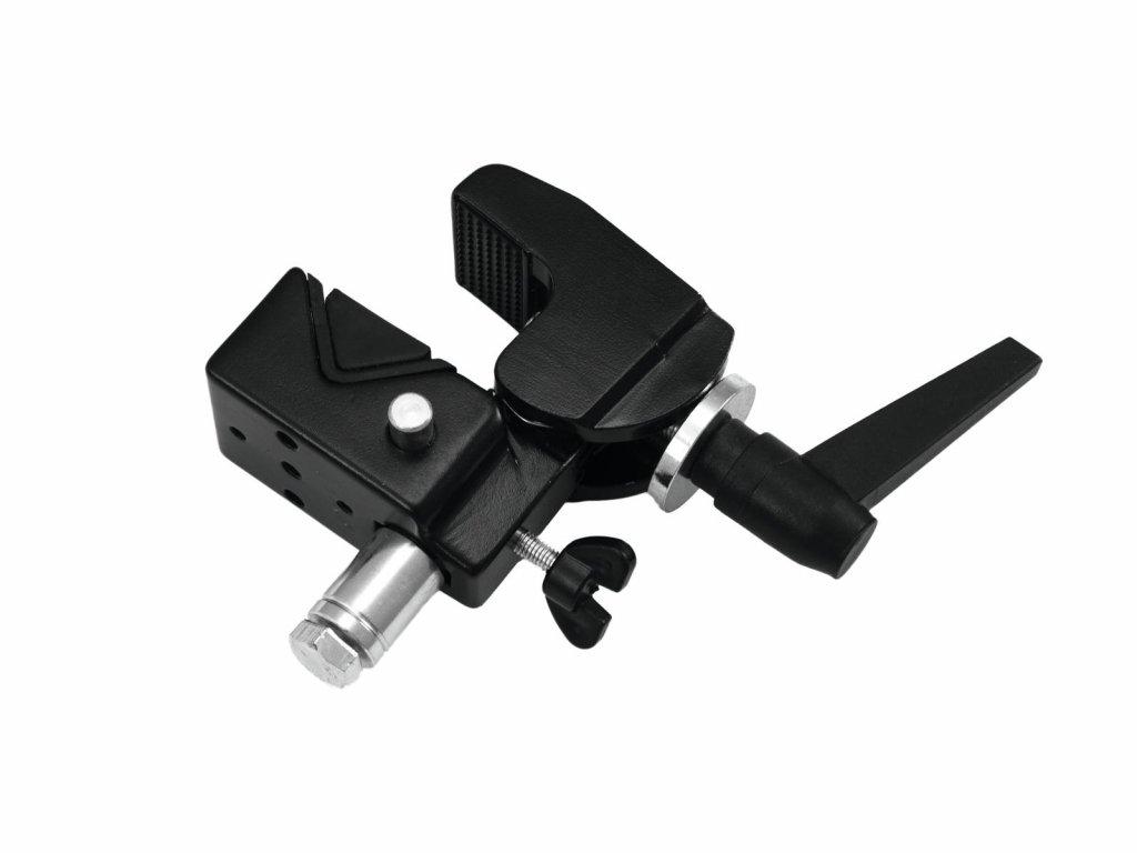 Hook for installing projectors, lighting effects etc. via a truss system. For tubes and plates from 13-55 mm. Fixation: hexagonal 5/8" socket and 1x M6 thread and 2 x M5 thread (f). Clamp opening min. round: 13 mm. Clamp opening max. round: 55 mm. Incl. mini TV pin.Maximum load WLL (4-fold): 15 kg
