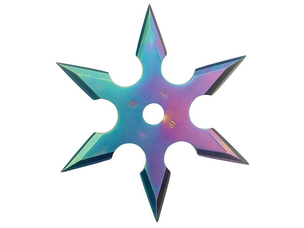 Satori šuriken - 90-16DRB Kvalitní vrhací hvězdice v duhové barvě 6 - cípa. Hvězdice je dodávaná spolu s pouzdrem, které je možné připnout i na opasek. - Nerezová ocel- Střibrná 6 bodová hvězda - Obsahuje nylonové pouzdro- Tloušťka 4mm- Délka 10 cm- Váha 167,82 g Při používání tohoto produktu dodržujte příslušná bezpečnostní opatření.Doplňkové parametry