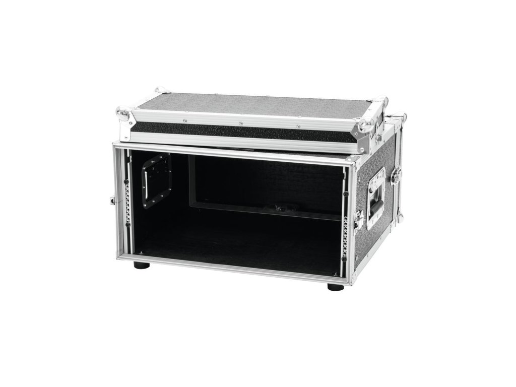 Suitable for 483 mm effectors and controllers (19"). 2 removable covers (double-door version). Built-in rack rails. High-quality workmanship with 6 mm plywood multilayered glued, black laminated. Aluminum profile frames (22 mm) with rounded edges. Three-leg, medium-sized steel ball corners. 4 spring locks with eyelets for locking-up. 4 large steel-enforced rubber feet. 2 chrome case handles. Delivery includes mounting screws. Available in different height units (1 U = 44 mm).Maximum load: 25 kg